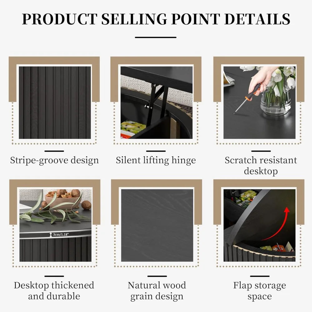 • Classic Farmhouse Style: Lift top coffee tables for living room features a simple round design with a unique vertical fluted panel, which perfectly blends modern style with rustic farmhouse style. The wood grain finish of the coffee table also adds a touch of nature, highlighting your unique aesthetic and taste, and complements any living room furniture and decoration