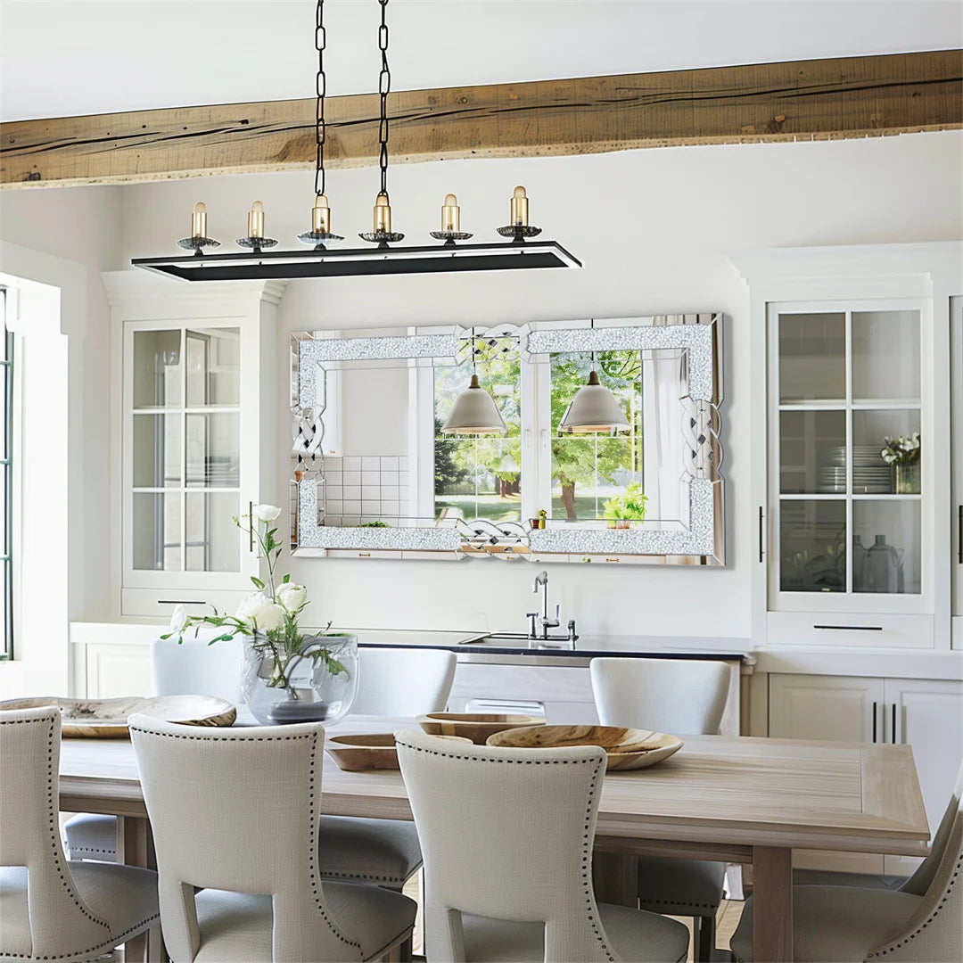 【Crushed Diamonds Inlay】This wall mirror features crystal crushed diamonds inlay the edge, which creates a more sparkle bling look, adds an exquisite touch of glamour and luxury to redefine the aesthetics and atmosphere of a space, sure to make a bold and dazzling statement anywhere, reflecting your unique style and personality.
