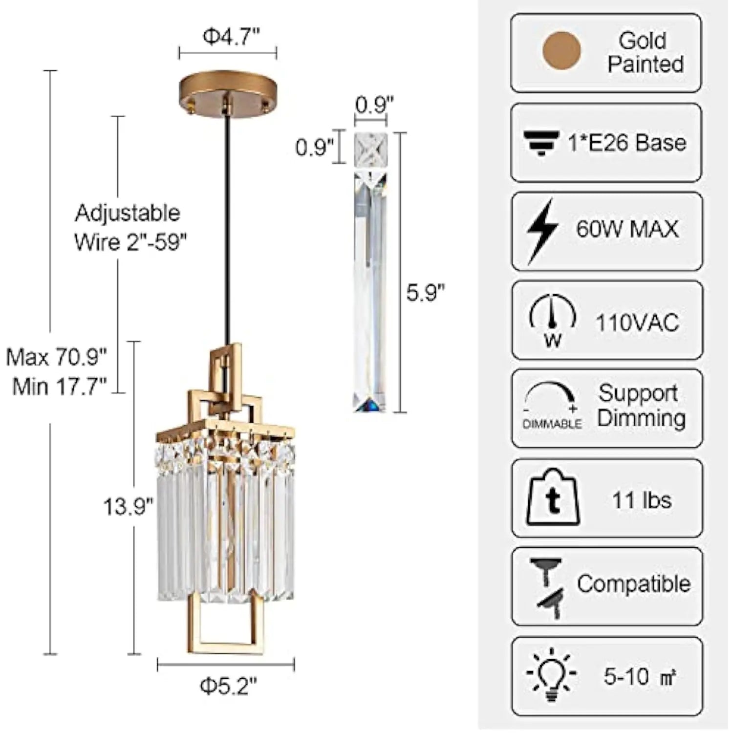 ❤ 【Simple & Glam Design】 Modern island pendant lighting is made of a gold painted metal frame and clear crystals shade, a simple and glam design. When you use a bright light bulb for it, will make your house look more wonderful. ❤ 【Size & Adjustable】 This gold crystal pendant light has a square metal frame, 13.9 length x 5.2 width, with a clear crystal strip to protect the light bulb. And it is equipped with 59 black electric wire, which can be assembled according to the height you need. ❤ 【Bulb Requirement & Dimmable】 The industrial pendant light is compatible with LED bulb, incandescent, CFL, Edison bulb, halogen bulb, etc. 1 X E26 based bulb, MAX 60W (Bulbs not included). It is fully dimmable with a compatible dimmer switch to create the perfect atmosphere (Bulbs and dimmer switch both are not included). ❤ 【Ideal Indoor Decoration】 Industrial style with a modern feel, this crystal chandelier light fixture is perfect for wide application, such as kitchen island, dining room, entryway, hallway, foyer, stairway, farmhouse, bars, cafes, hotels, and restaurants, etc. ❤ 【Easy Installation & Attentive Service】 This item is a 1-pack. Full set of detailed installation instructions and hardware accessories for your easy installation. If you need to find seller support, you can contact us through Amazon message or email, we will reply within 24 hours.