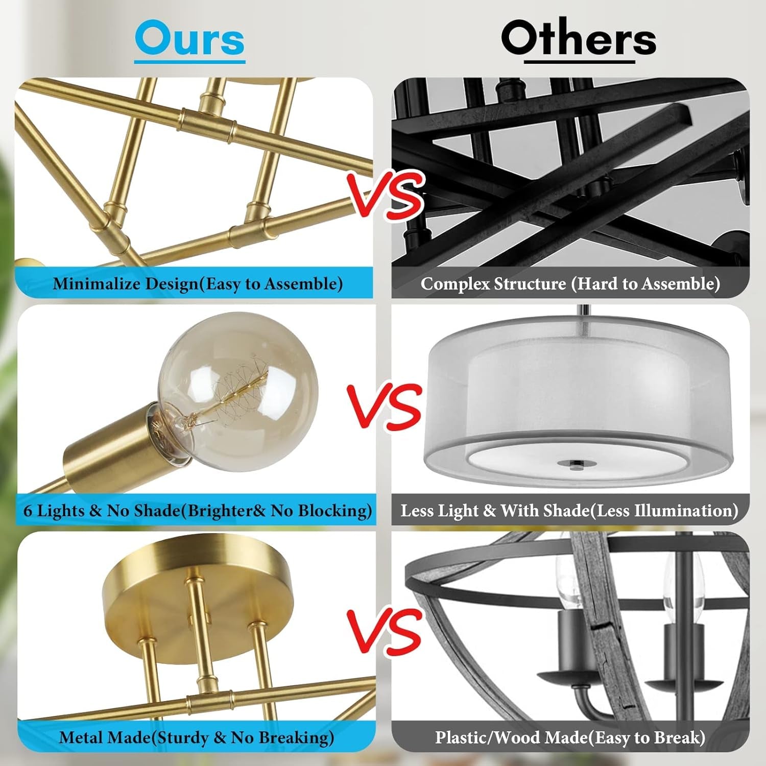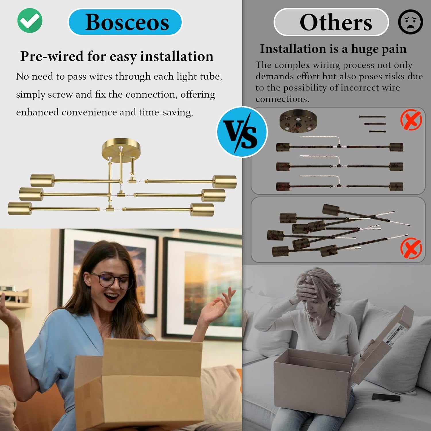 Choose Bosceos for quality and style in your lighting solutions. Our products are crafted with care, ensuring a safe and enjoyable environment for you and your loved ones. Illuminate your home with this stunning 6-light gold Sputnik semi flush mount chandelier today!