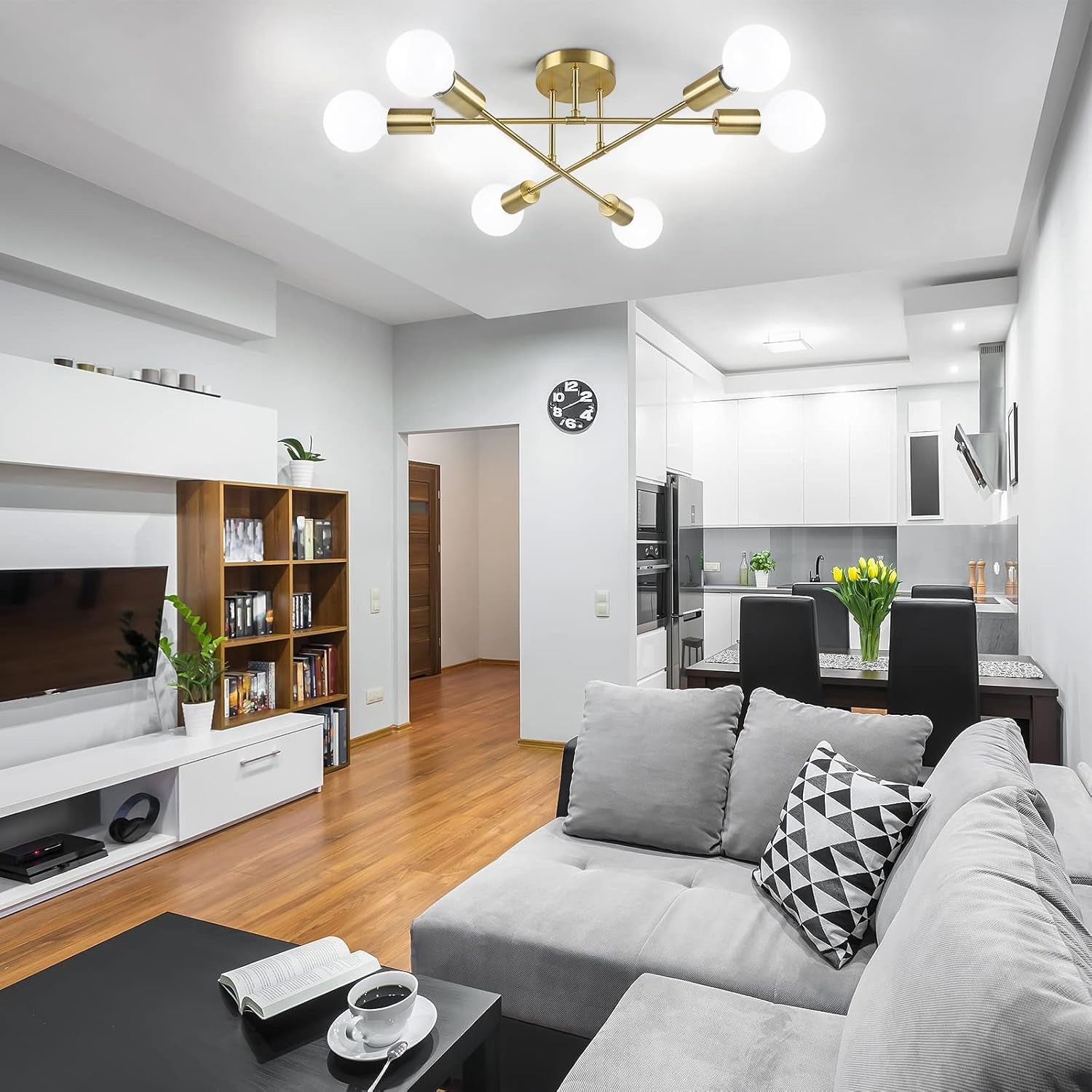 This exquisite 6-light gold Sputnik semi flush mount chandelier combines modern and retro design elements, adding a touch of elegance and charm to your home. Perfect for any décor style, it enhances the ambiance of any room, making it an ideal lighting fixture for your bedroom, dining room, living room, hallway, kitchen, salon, bar, or coffee house.