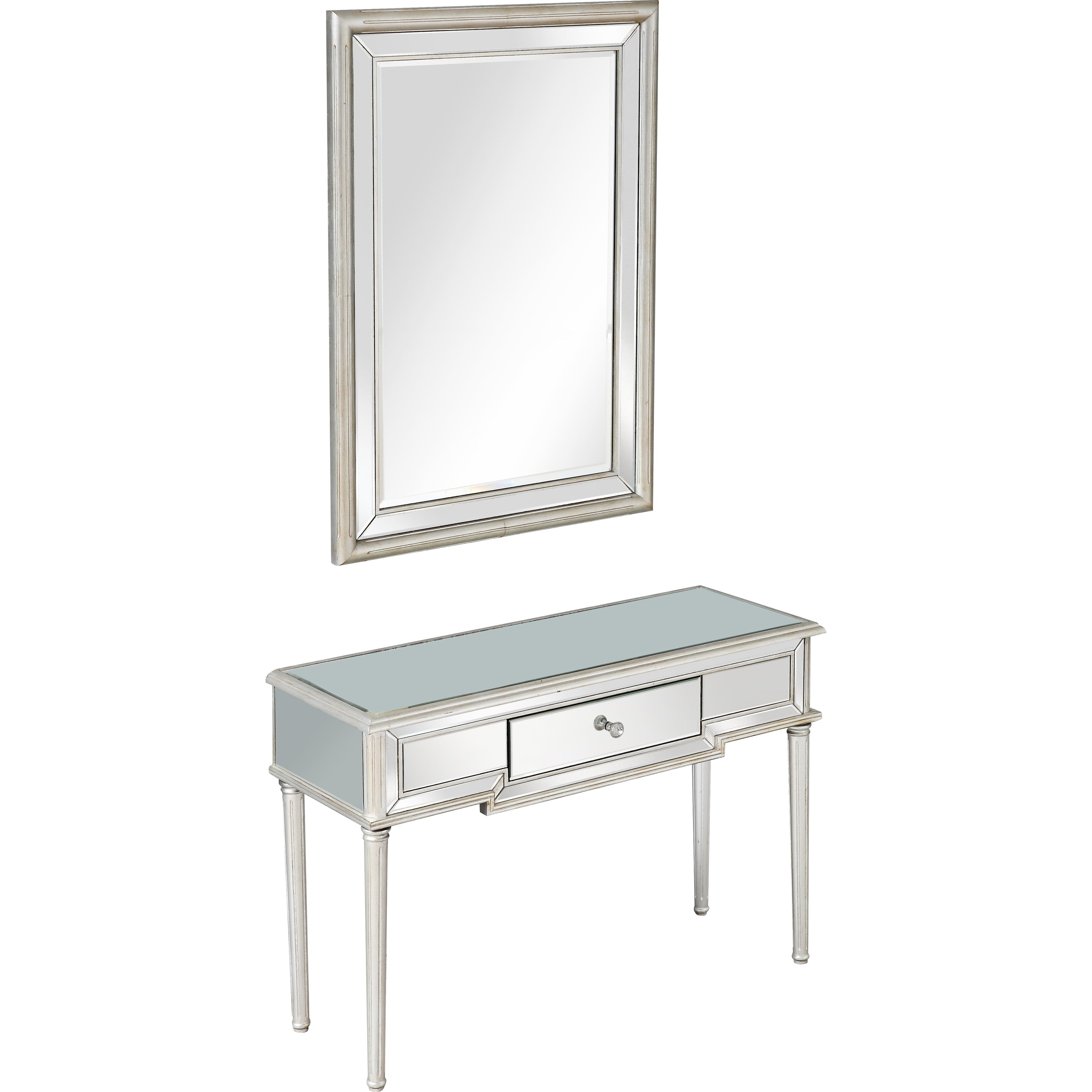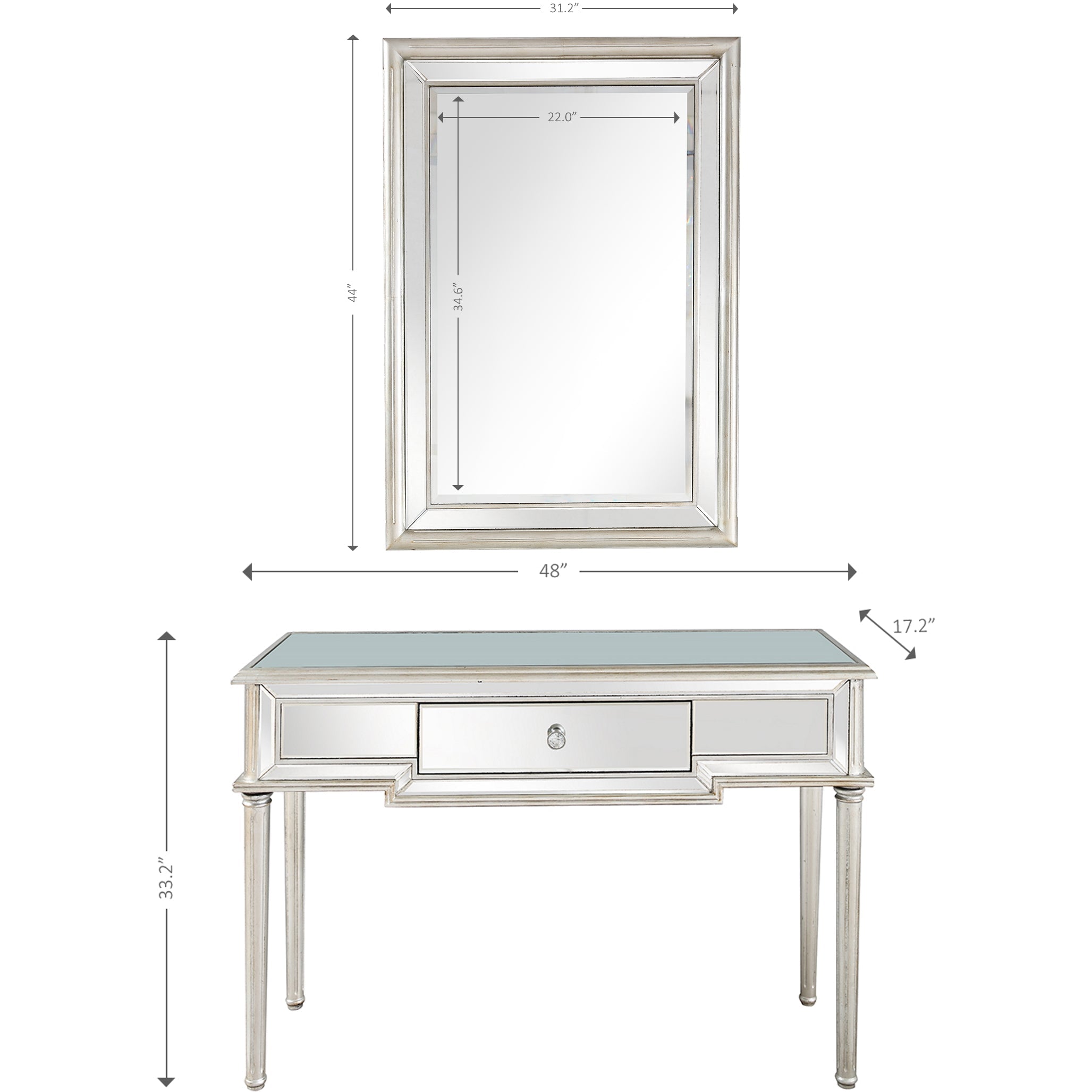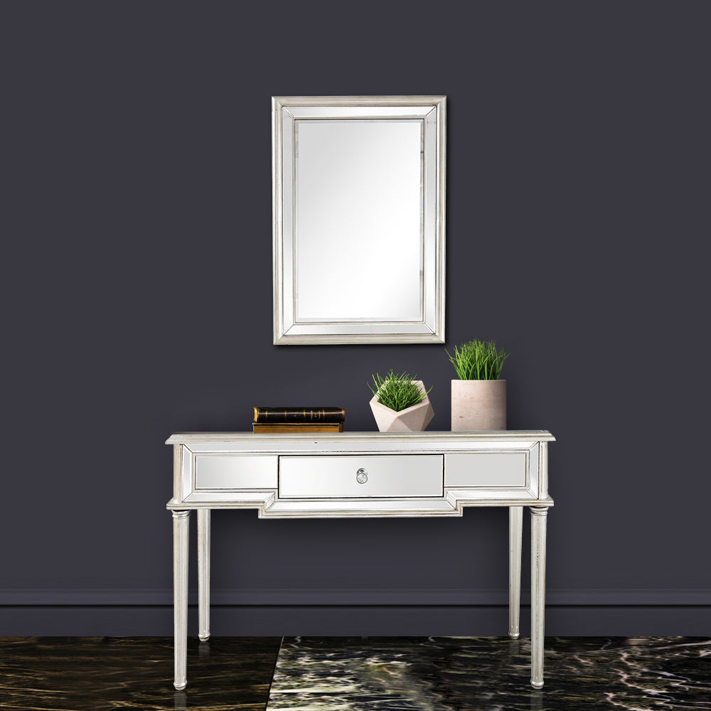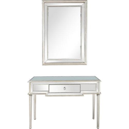 If your hallway or foyer needs an elegant finishing touch, the Morgan Mirror Console is what you need to create a timeless look. The console features a combination of both clear and antique mirrors, making it a perfect decoration piece for any living space. The regal crystal knob and silver leaf with light antique finish give it a stylish appearance that blends seamlessly with modern or classic interior designs. The Morgan Beveled Accent Mirror instantly creates an illusion of space with its rectangular shape and silver leaf finish. Clean and elegant, this well-made mirror features antique mirror strips along its borders that complement both modern and traditional interior designs. When paired with a lovely wall painting, this mirror adds an entirely new touch to your room. Beveled 31.2 x 44 mirror has a high quality silver backing. Ready to hang either vertically or horizontally with pre-attached hanging mounts.