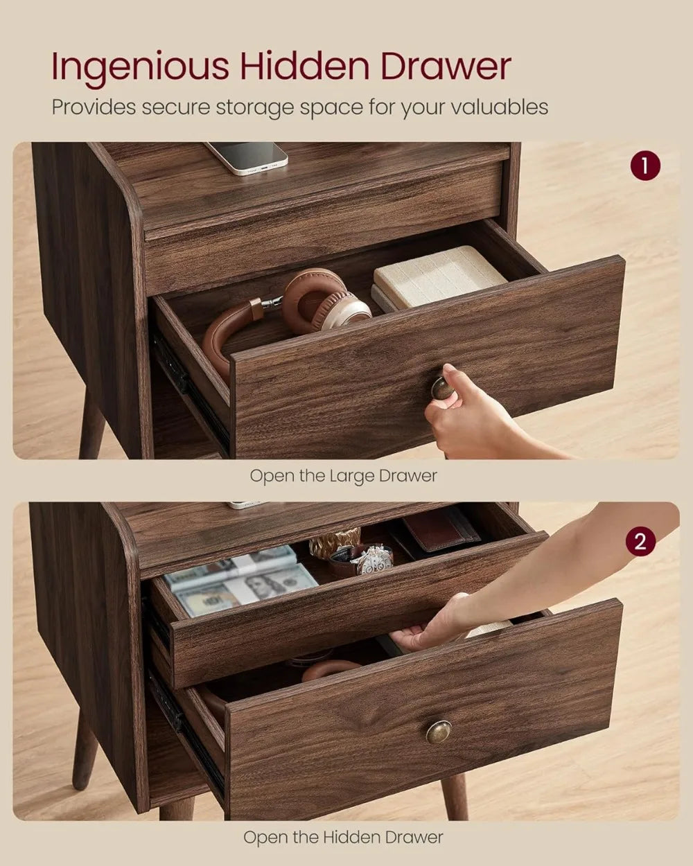 Nightstands, Set of 2, Bedside Tables with Hidden Drawers, Mid-Century End Side Tables with Solid Wood Legs, for Bedroom,