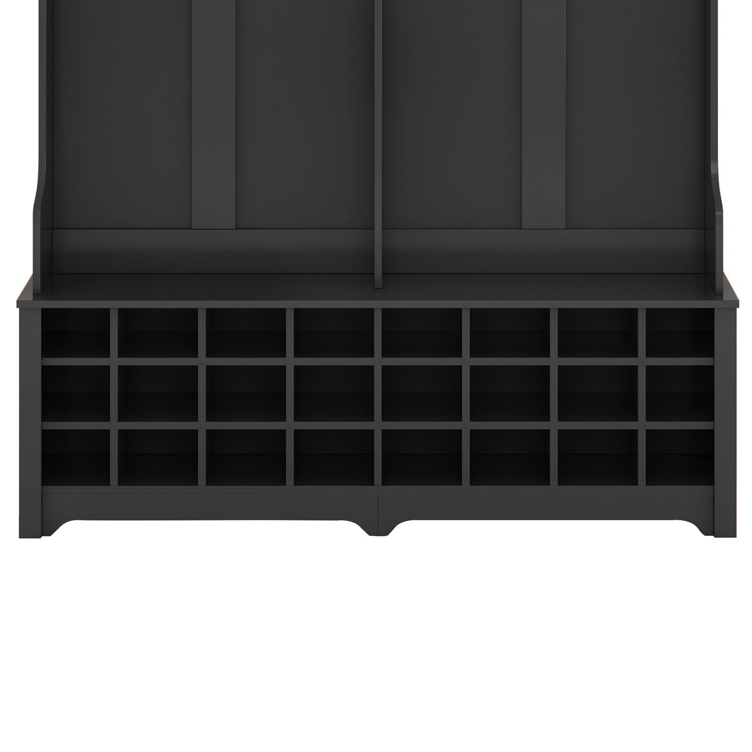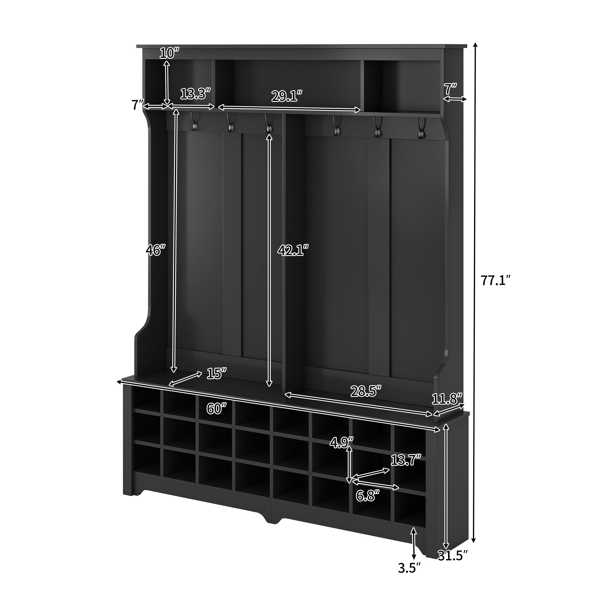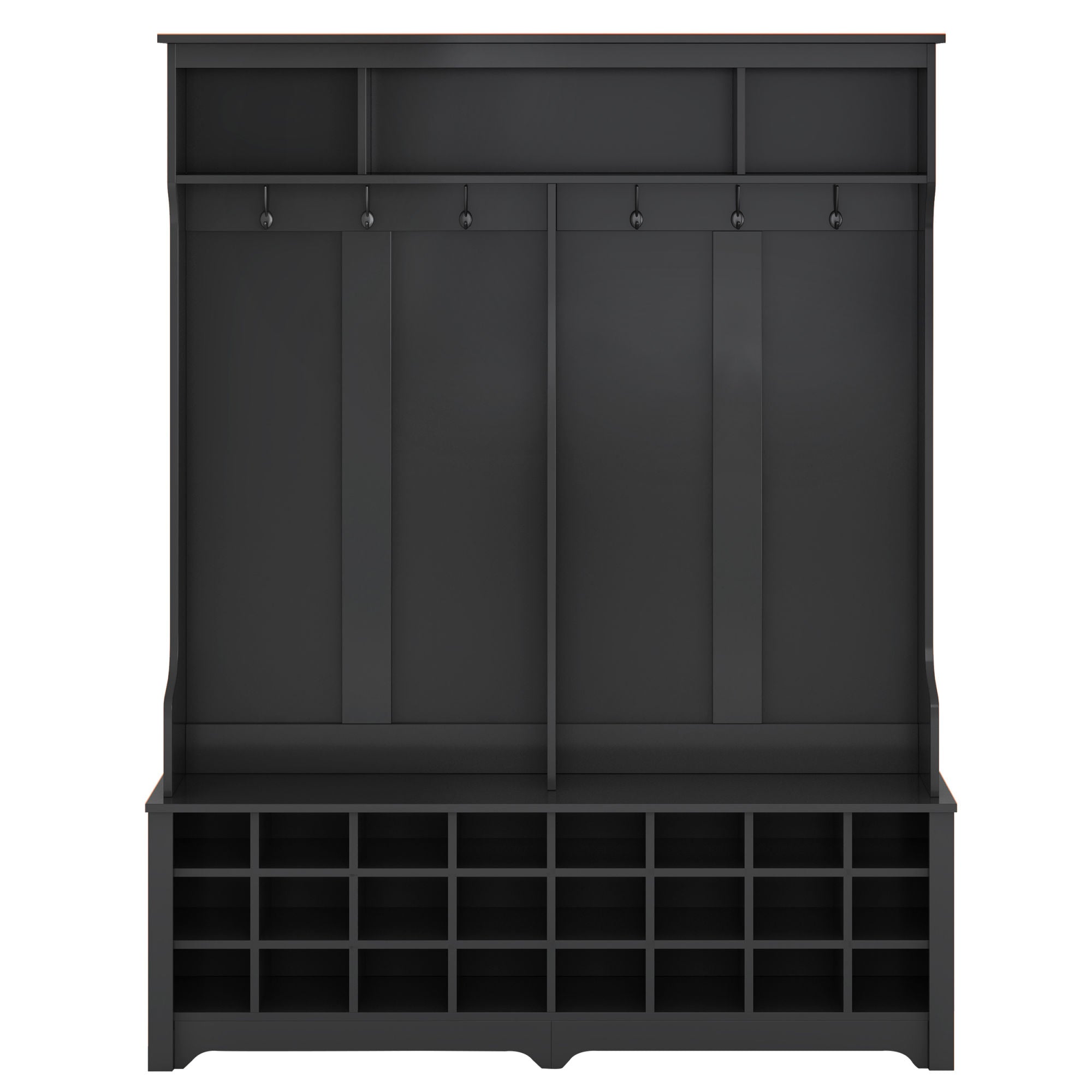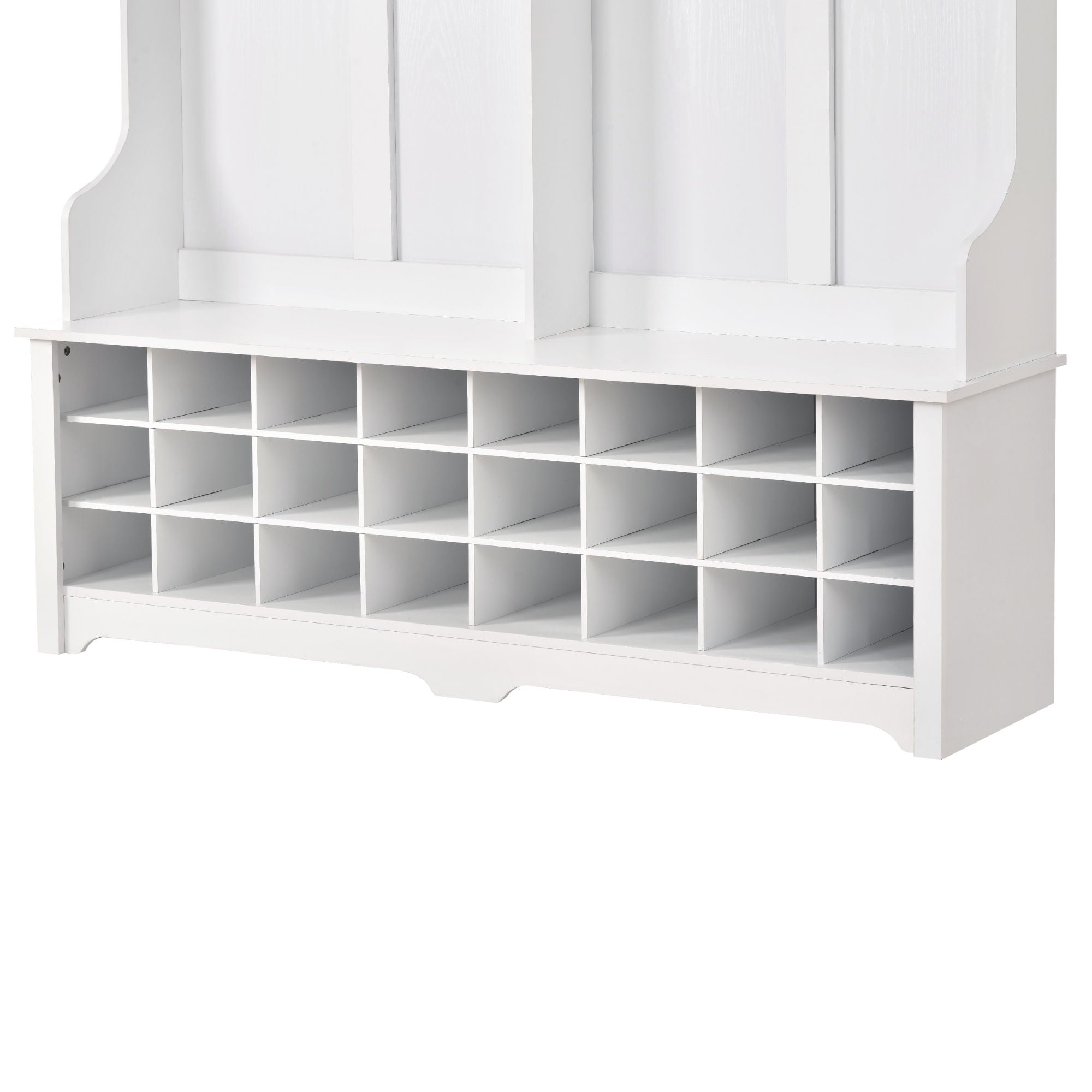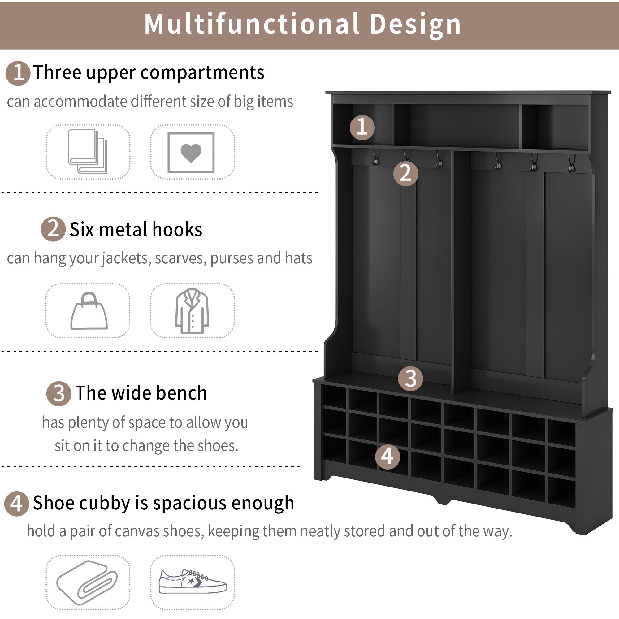 The three upper compartments can accommodate different size of big items; and the six metal hooks can hang your jackets; scarves; purses and hats. The wide bench sits on top of 24 individual shoe cubbies; and it has plenty of space to allow you sit on it to change the shoes. Each shoe cubby is spacious enough to hold a pair of canvas shoes; keeping them neatly stored and out of the way.