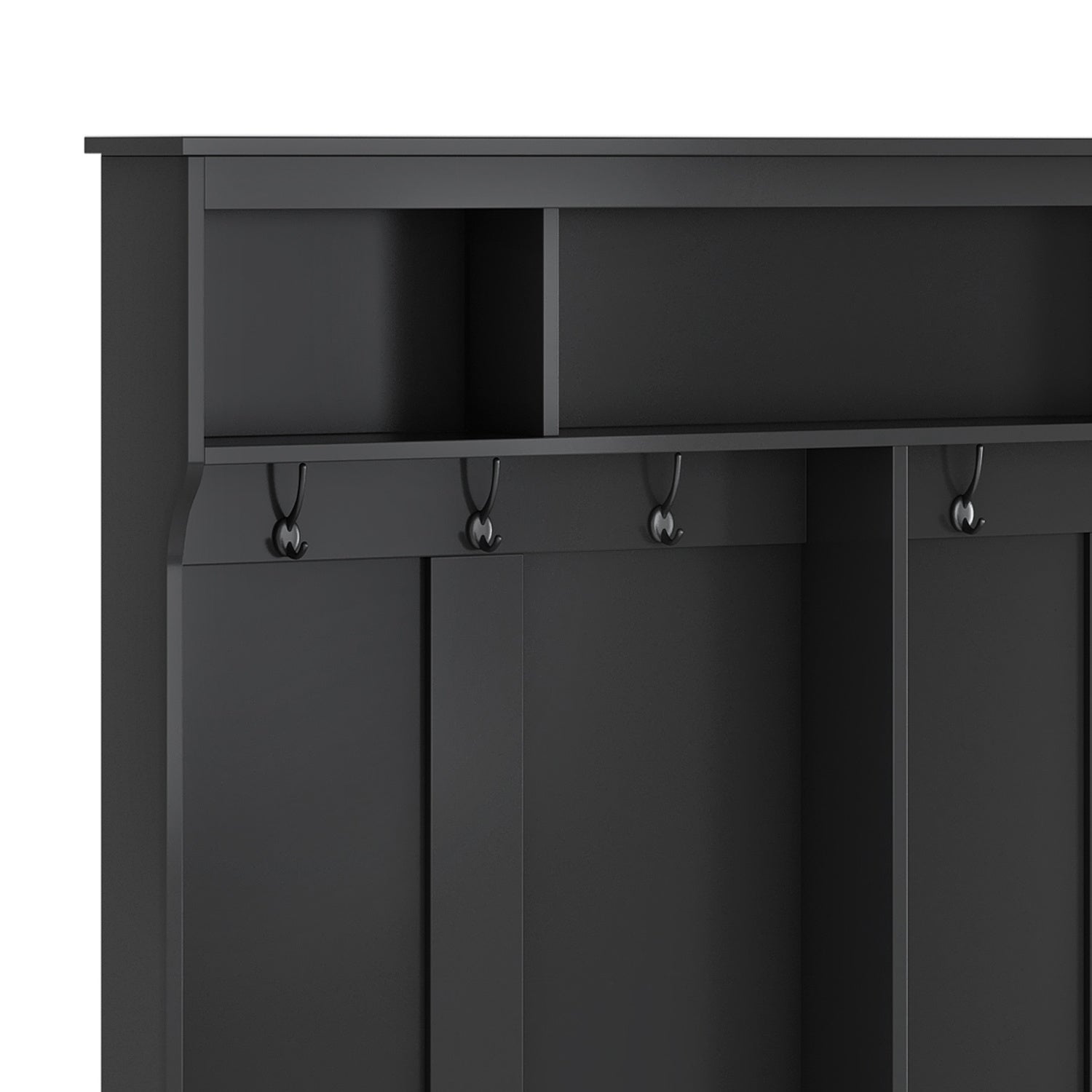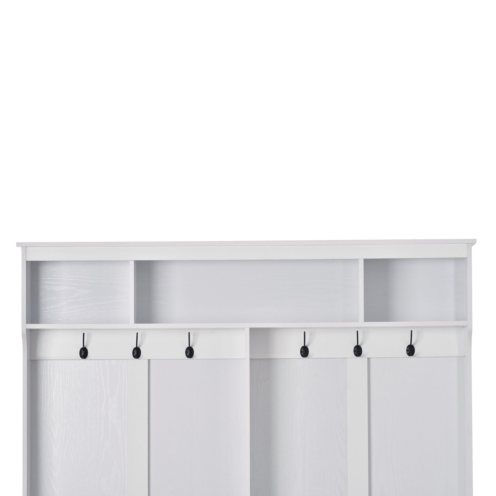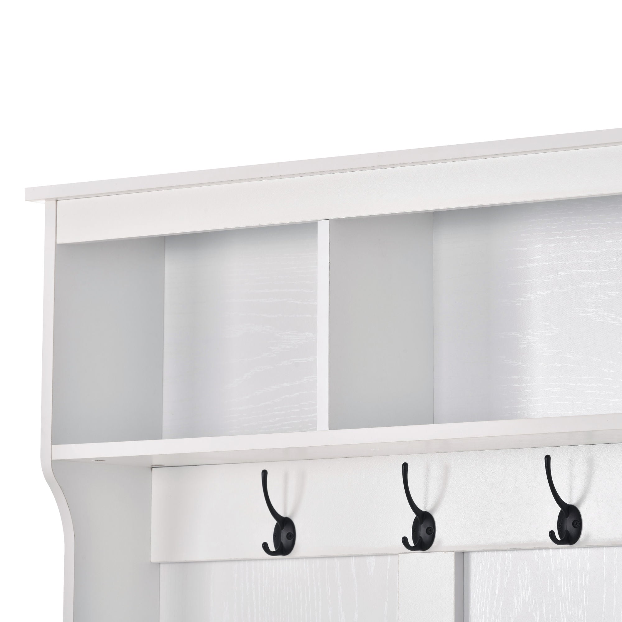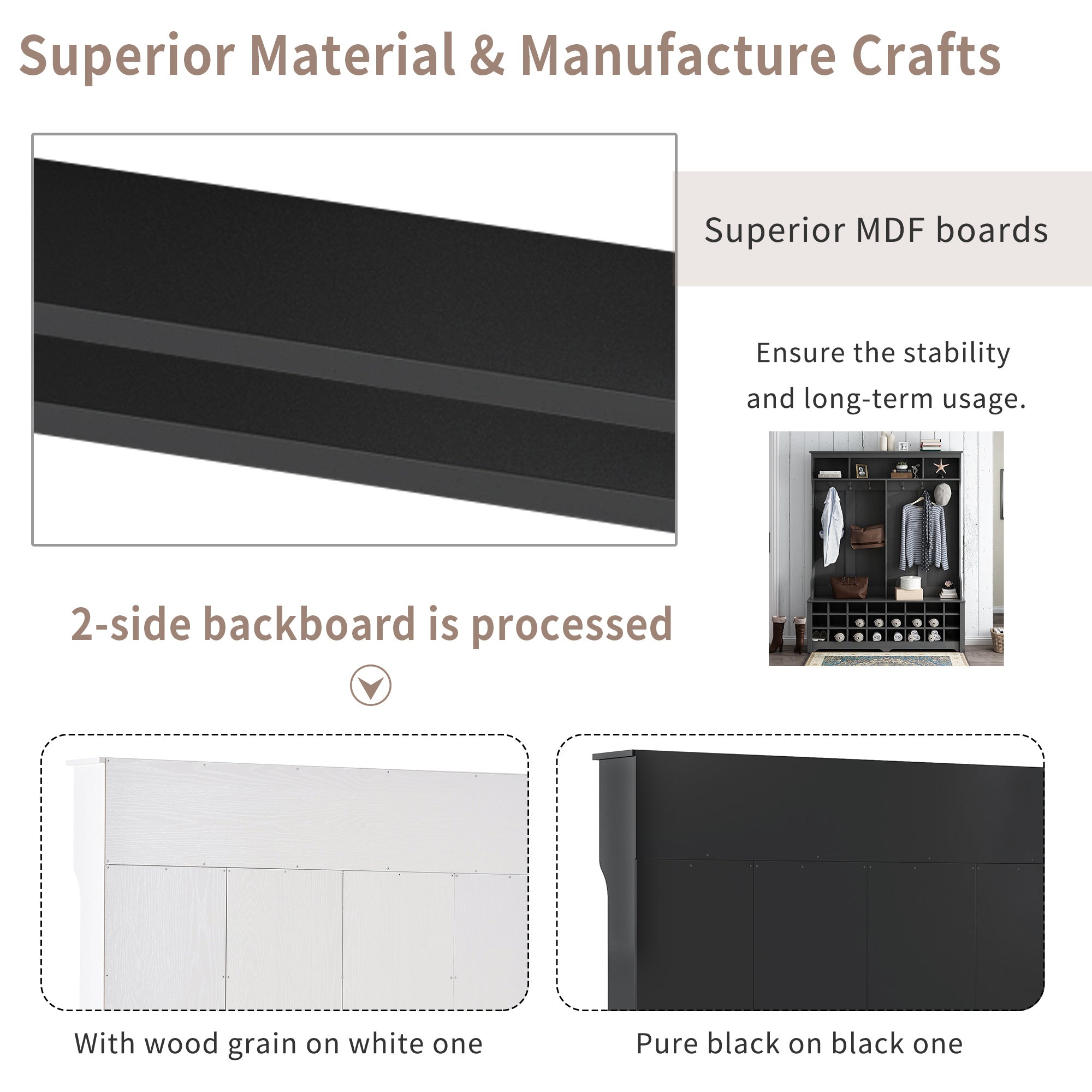 Such a functional furniture located at entryway needs high quality material to ensure the stability and long-term usage. In this case; this hallway coat rack is made of MDF boards to guarantee the durability in usage. The 2-side backboard of this furniture is processed with wood grain on white one; and with pure black on black one.