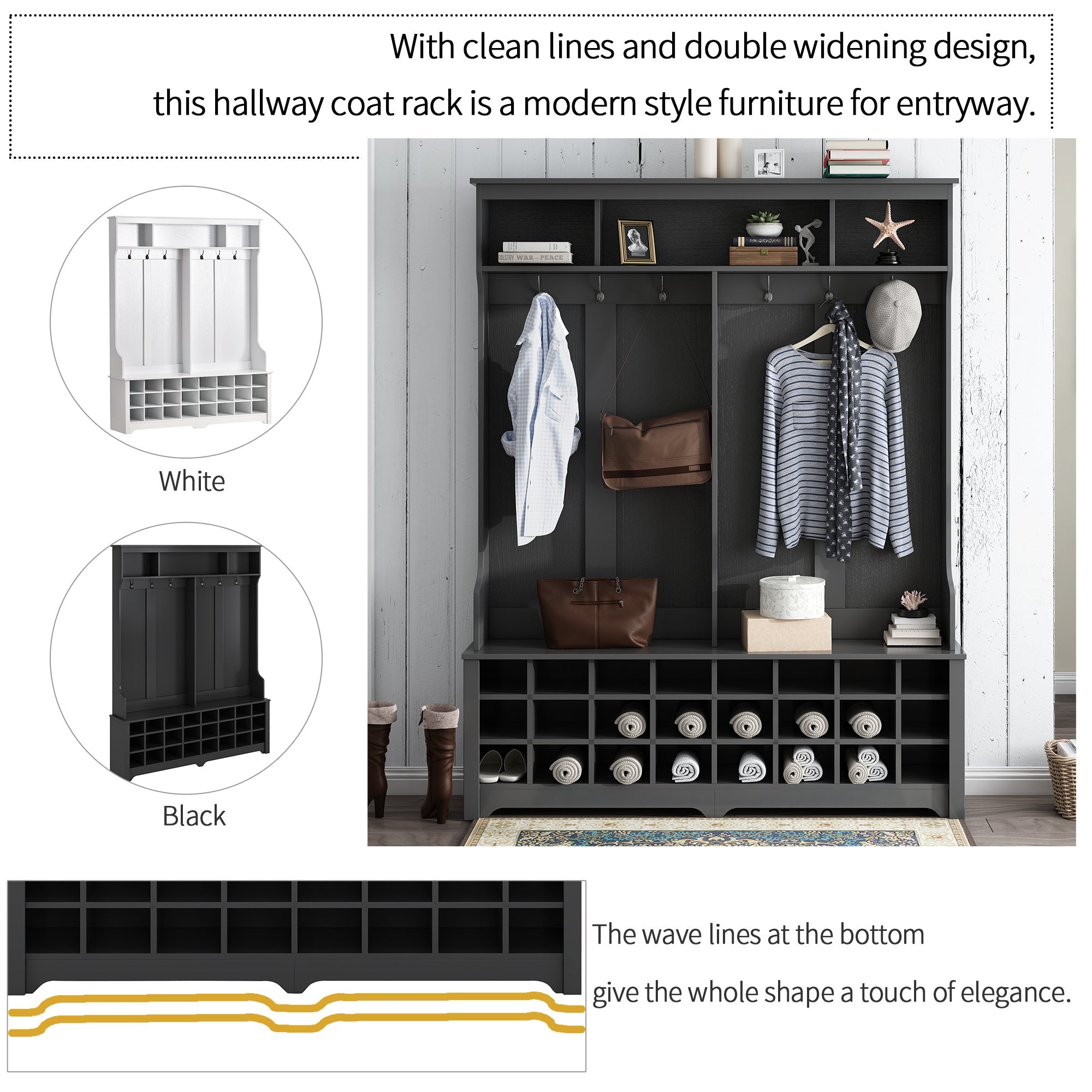 With clean lines and double widening design; this hallway coat rack is a modern style furniture for entryway. The versatility of this hallway coat rack will provide all the storage space needed for the entryway belongings. The bottom of the multi-grid design can be used as shoe rack or other arrangements. The wave lines at the bottom give the whole shape a touch of elegance.