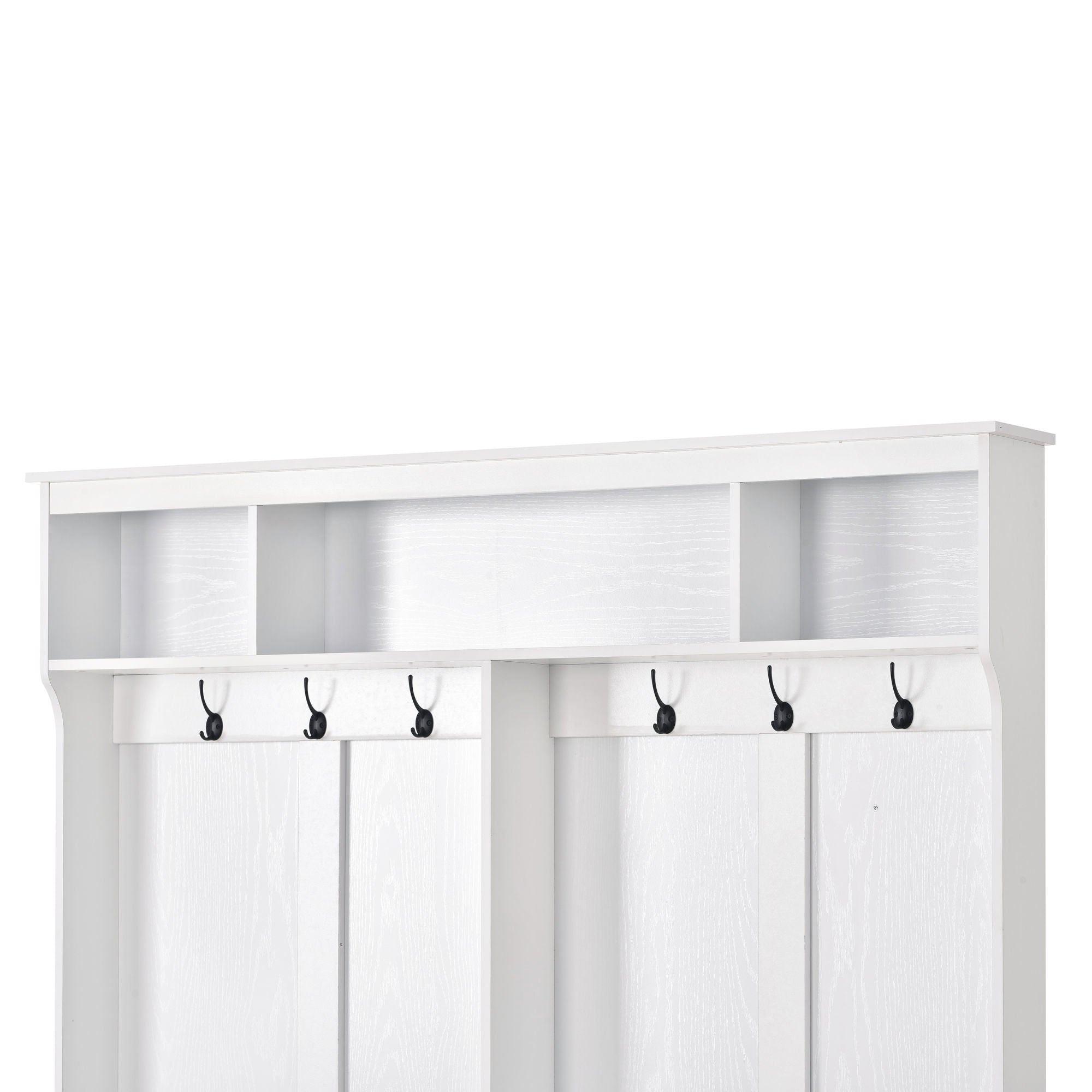 This modern style hallway coat rack has simple and clean lines; and the multiple functional design makes this furniture be a perfect choice for your entryway space. Several kinds of storage space offer ample and different space to storage different size of items. The number of shoe cubby at the bottom of this furniture are rich to 24; this part will be a great place for your shoes. Details and accessories for safety also make it easy for users to use in daily life. High quality materials guarantee the stability and durability in long-term usage. White and black color options of this product allow you to pick the prefer one as you wish.