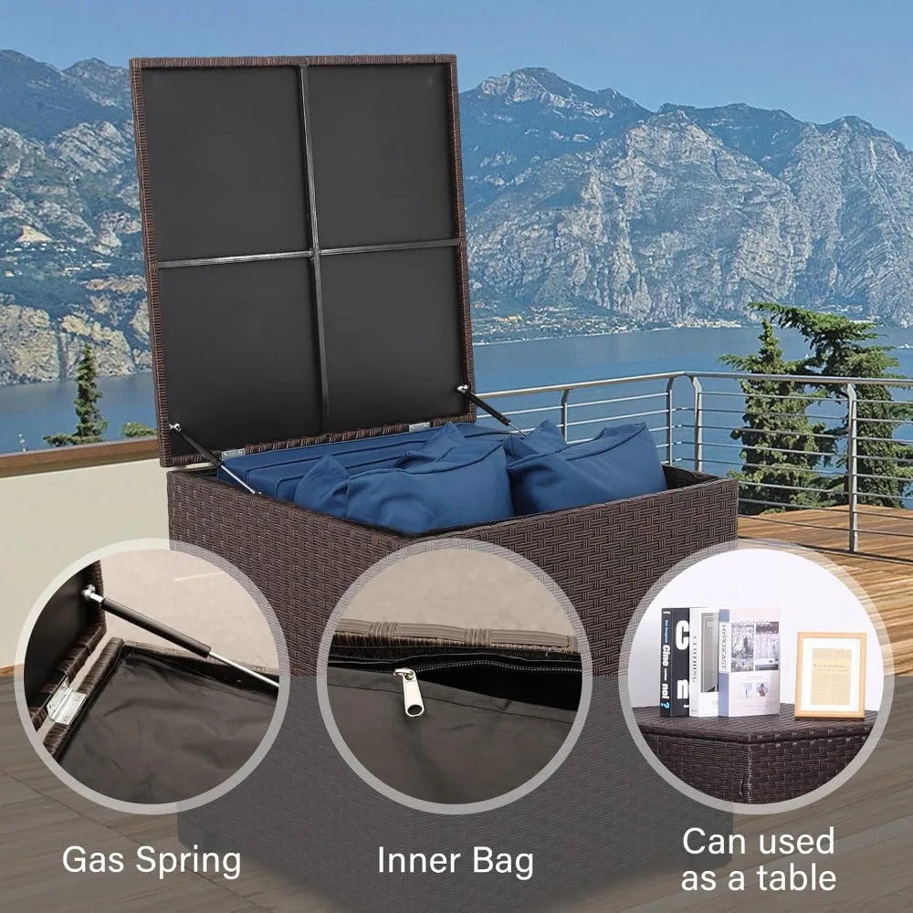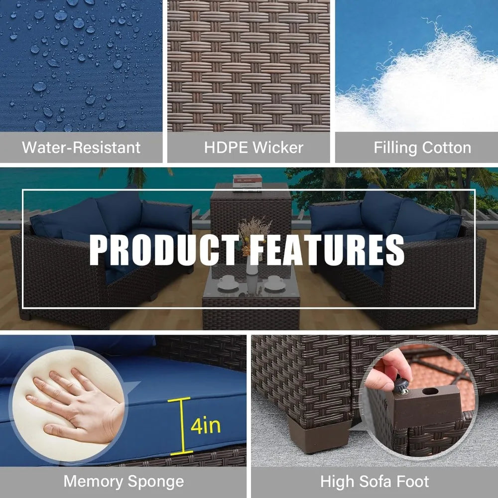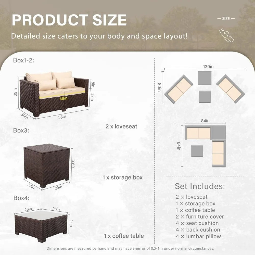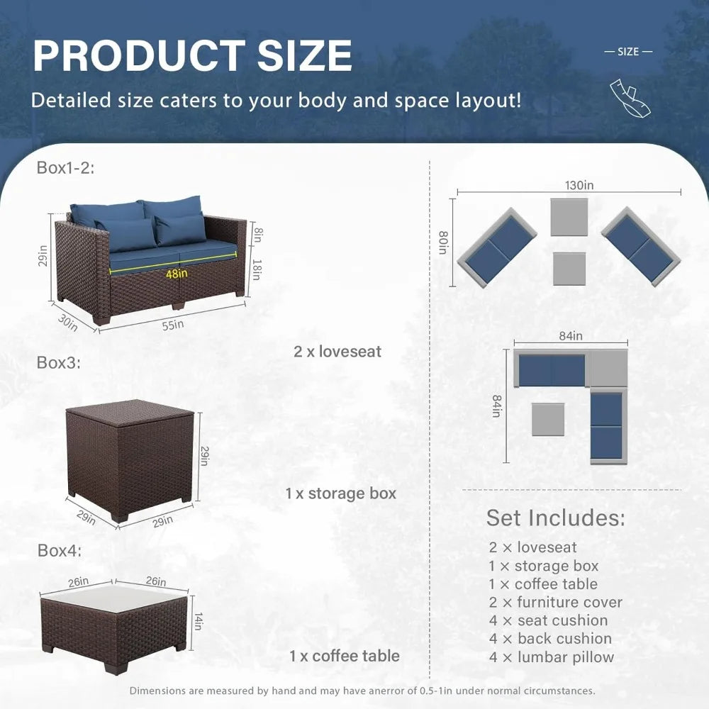 Feature: This patio furnture sets are artfully designed, stylish, fashionable and comfortable. Hand-woven HDPE wicker, solid metal frame, large space designed storage box, coffee table with tempered glass, a complete set perfect for any need, suitable for any decorative scene, is the best choice for indoor and outdoor decoration. You can enjoy relaxing time indoors or outdoors with your family and friends.