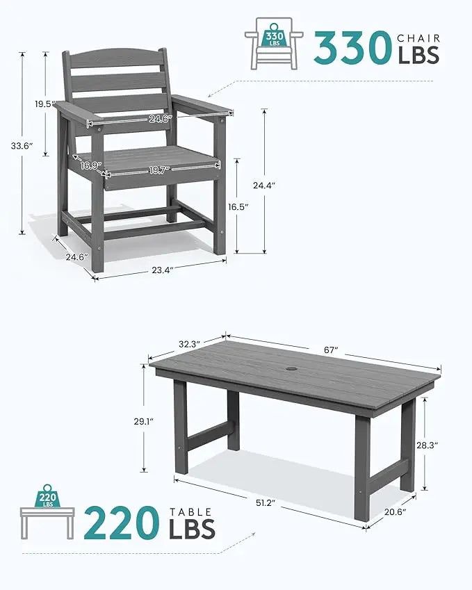【All Weather Use】SERWALL patio dining sets are built to withstand the elements and provide long-lasting performance. The sturdy frames and high-density polyethylene materials ensure durability and reliability, allowing you to enjoy outdoor dining for years to come.