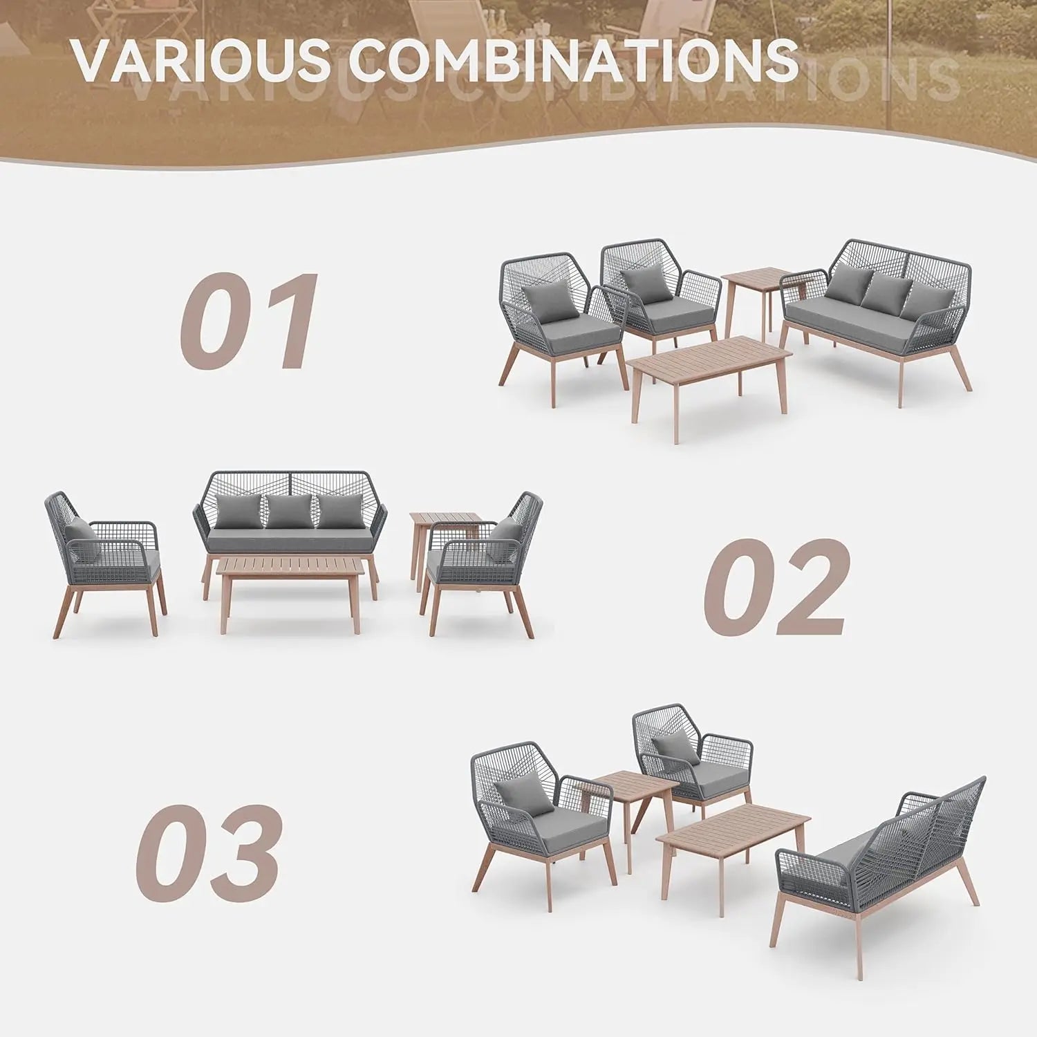 Outdoor Patio Furniture Set,5 Pieces Indoor Rope Woven Sectional Sofa Set Modern Oak Patio Conversation Sets with Wooden T