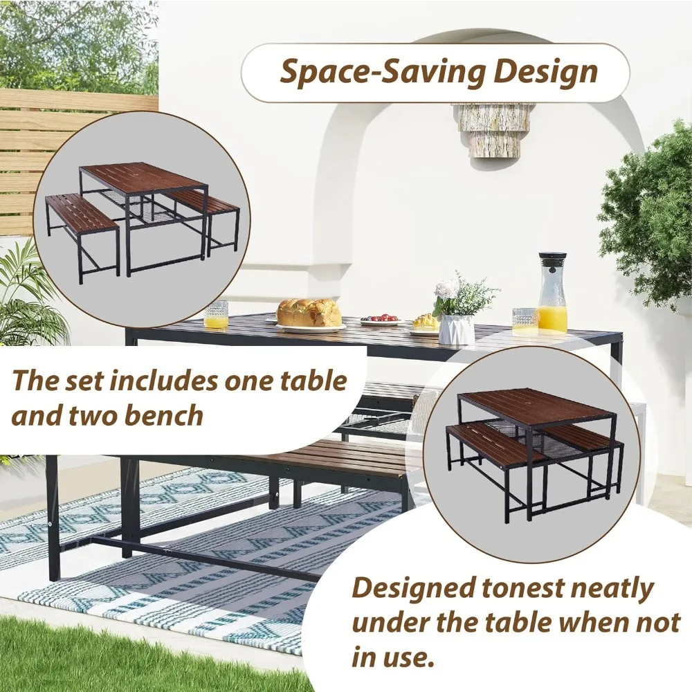 Versatility: The dining table and bench set are designed with a classic shape combined with a fashionable style, which can complement various styles of courtyard decoration, suitable for parks, courtyards, dining establishments, hotels, B&Bs and other places, creating a stylish and simple rest space. To maximize space savings, place a bench along the wall to provide enough space for your guests without having to move chairs in or out.