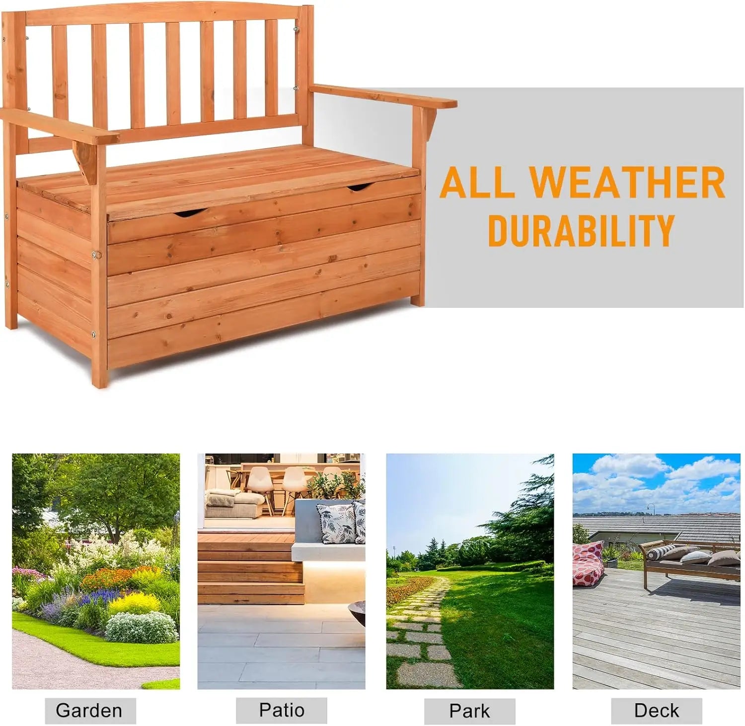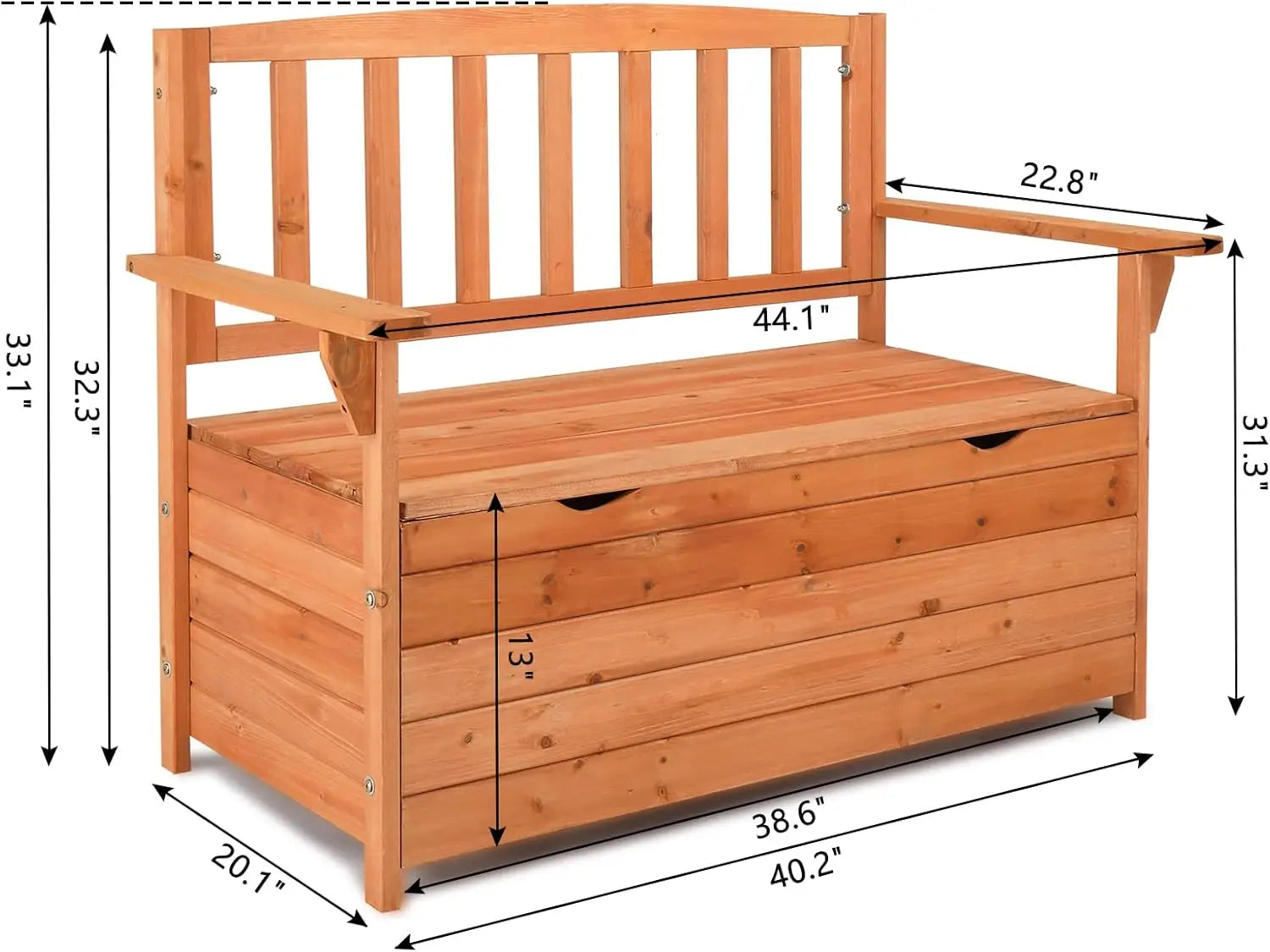 • Generous Hidden Storage: Store patio cushions, pool toys, or gardening tools effortlessly in the 45-gallon interior (40"L x 20"W x 13"H). The grooved handle and reinforced wooden hinges of the wooden bench allow smooth one-handed lid access while maintaining sturdy support.