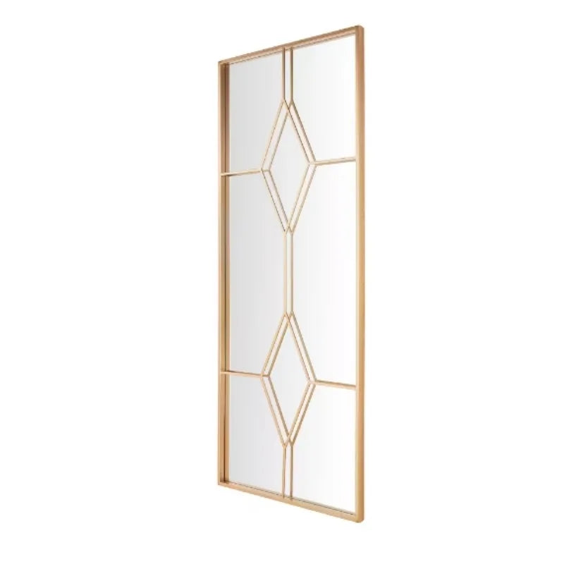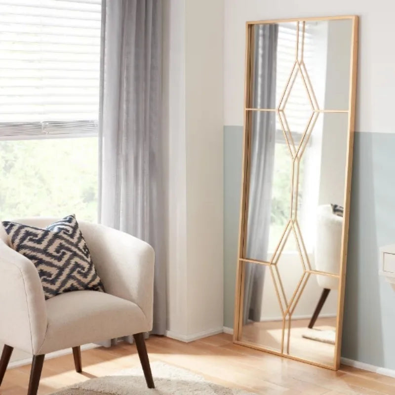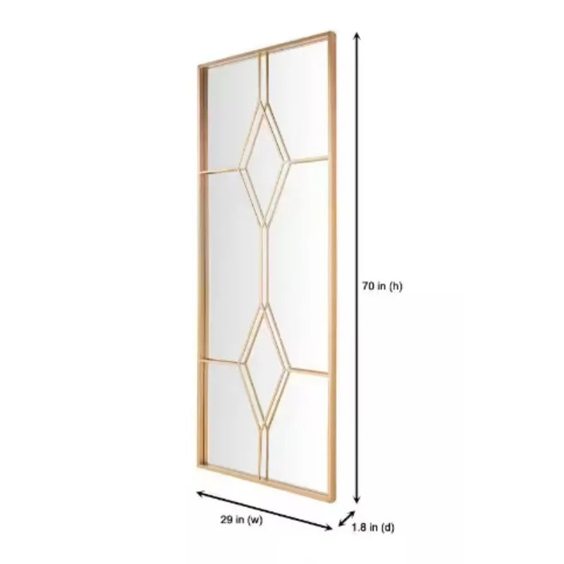 Enhance the visual appeal of your room with the Oversized Gold Metal Frame Windowpane Classic Floor Mirror. It features a sleek gold-finish frame with diamond patterns for accentuating a classic-style decor. The mirror comes with key rings on the back that allow for quick and secure mounting. You can use a soft, dry cloth and a standard glass cleaner to keep the reflective surface clean.