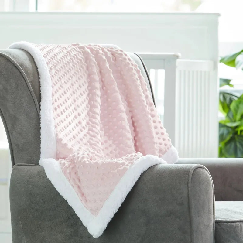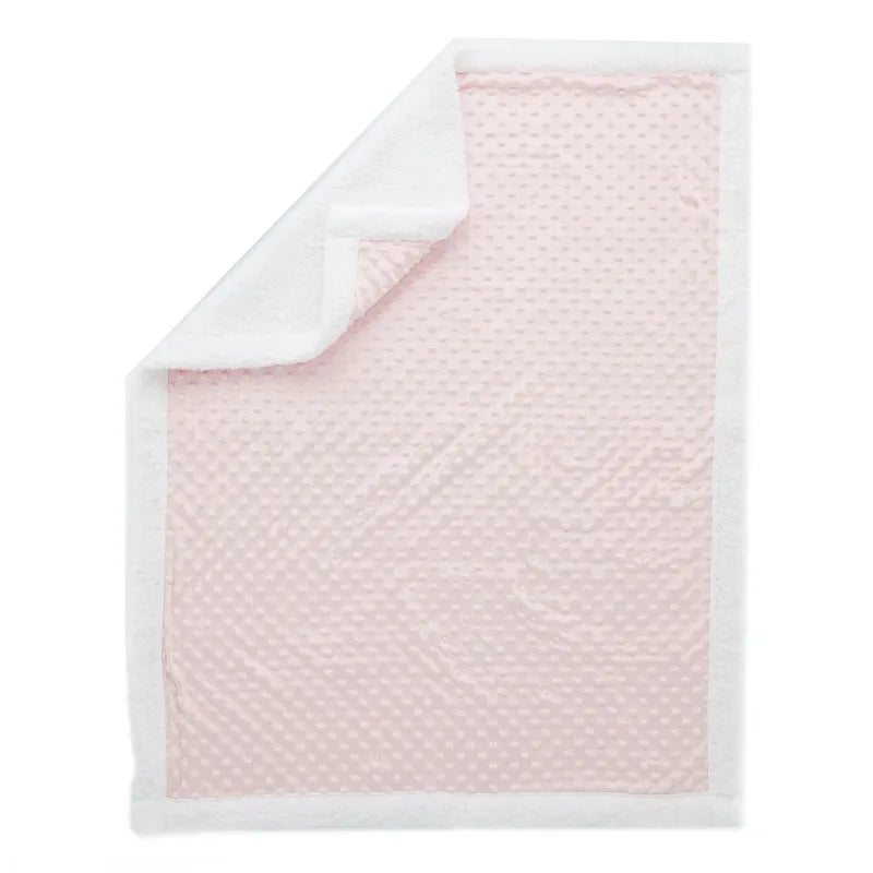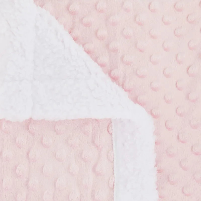 Reversible blanket has a pink textured front, solid sherpa back, and sherpa border edge