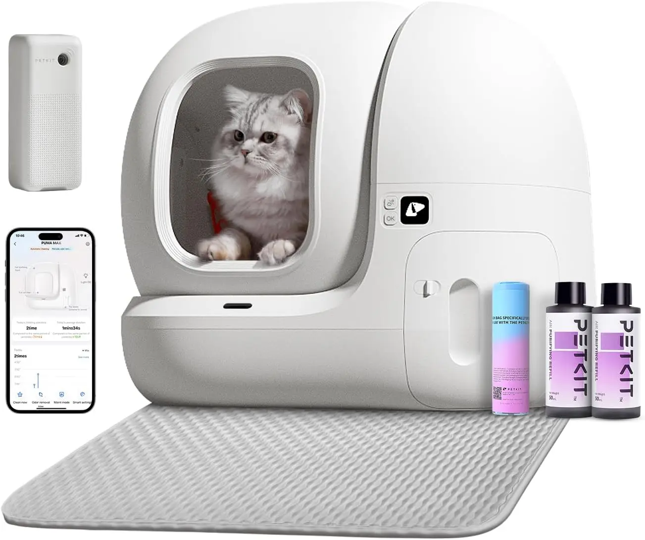 Package List: PETKIT PuraMax, K3 air purifier smart spray, cat litter mat, clay litter sifter, cat litter romver, waste bag 20pcs, air purifying refill 2 bottles, power adapter, user manual, quick start, DIY stickers.