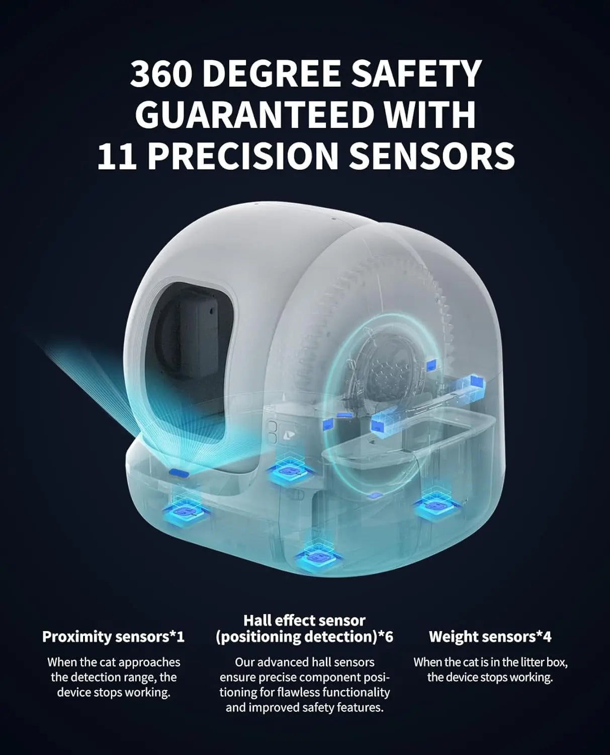 Double Odor Removal: 100% sealed waste bin and removable odor eliminator, the waste is transported into the waste bin inside the litter box. The tightly sealed waste bin prevents unpleasant odours. Air Purifier Smart Spray deodorizes automatically after cleaning,planned deodorization via app.