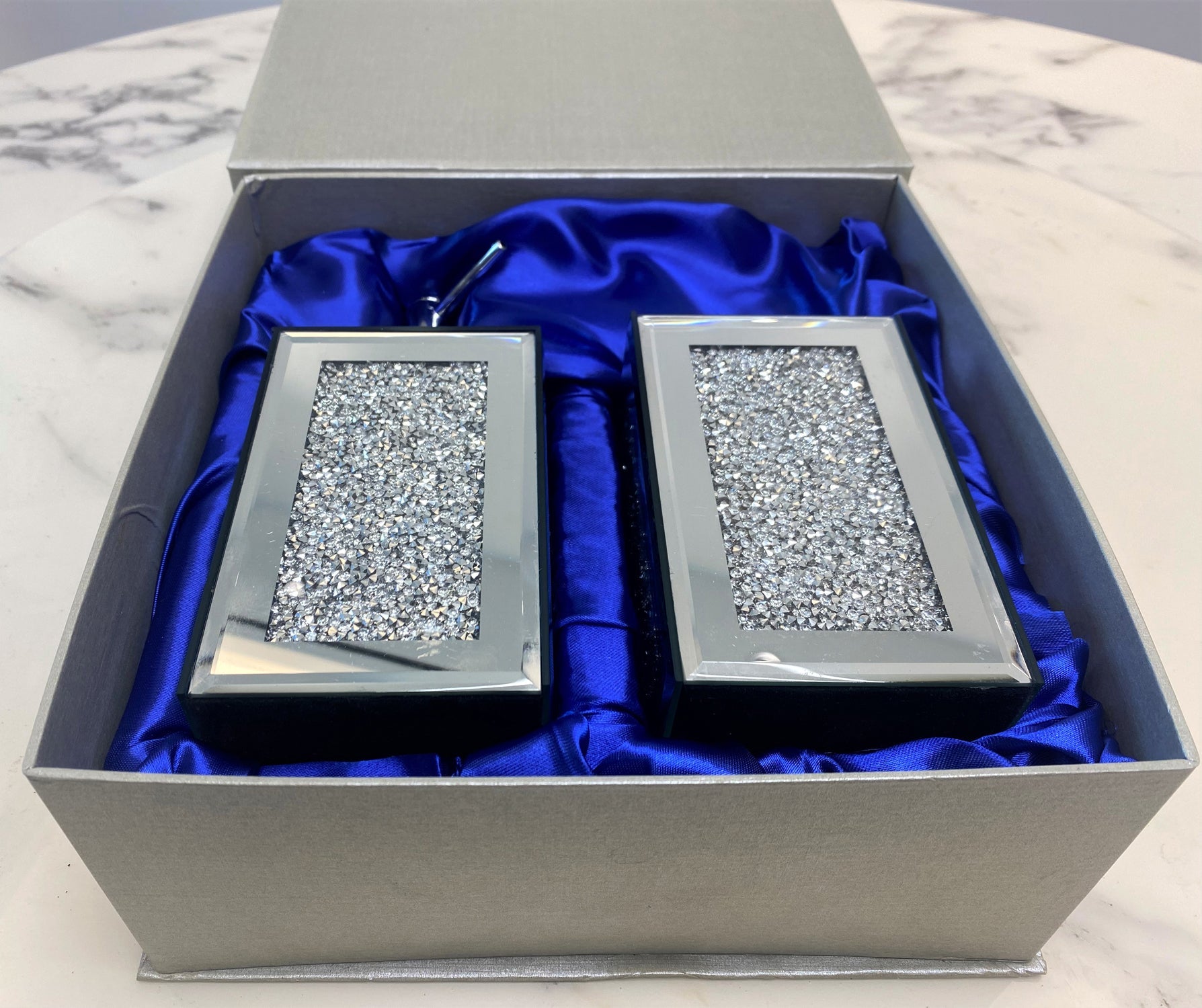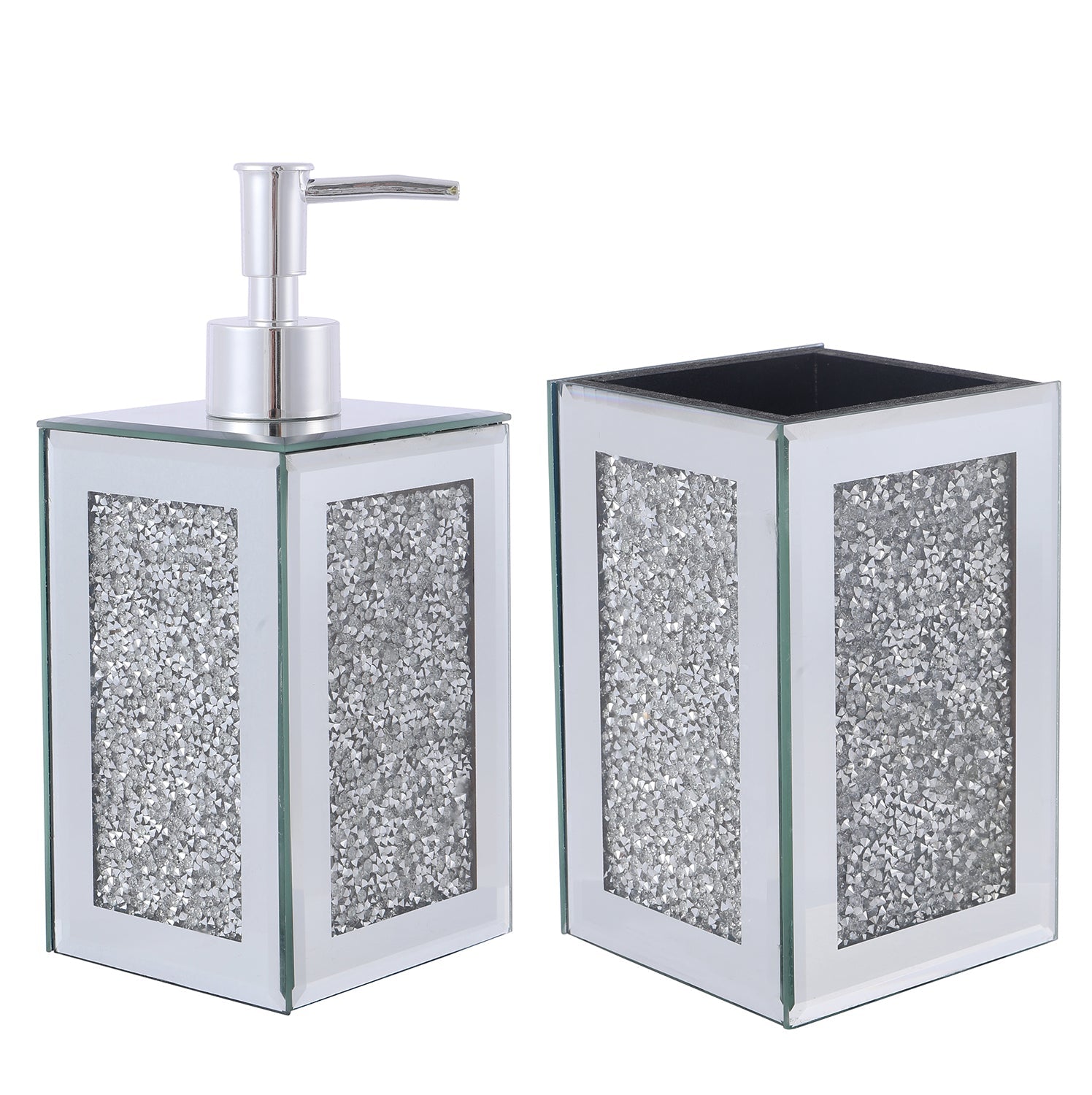Exquisite two piece square soap dispenser and toothbrush holder in a gift box. Features crushed diamond glass with chrome lid, base, and dispenser. Perfect accessory pieces to embellish your spaces, featuring great durability with a modern design and adding a chic touch to any bathroom. Packaged in an elegant box, this is a perfect gift idea.