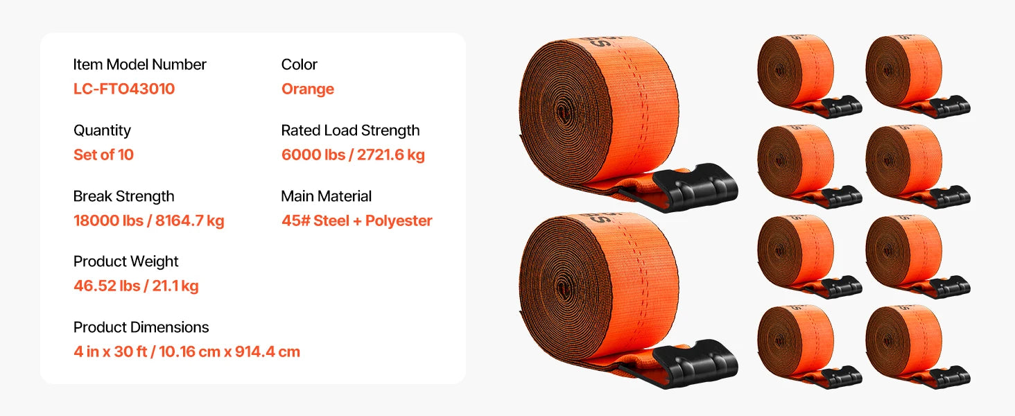 Impressive Load Strength: These winch straps are designed with a rated load capacity of 6,000 lbs and a breaking strength of 18,000 lbs, making them suitable for securing heavy items such as construction materials, timber, and large pipes. The set includes 10 sturdy straps, each measuring 4 inches wide and 30 feet long, ensuring you have ample tools for all your cargo securing requirements.