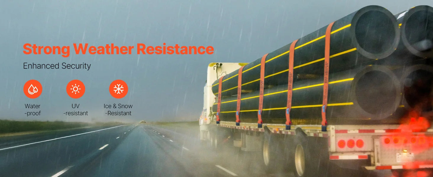 Durable Polyester Material: Crafted from robust polyester, these truck straps resist deformation, shrinking, or stretching caused by exposure to sunlight, rain, or other environmental factors. They provide consistent performance and reliability compared to straps made from alternative materials. Perfect for use in wet, snowy, or freezing conditions, ensuring secure transportation every time.