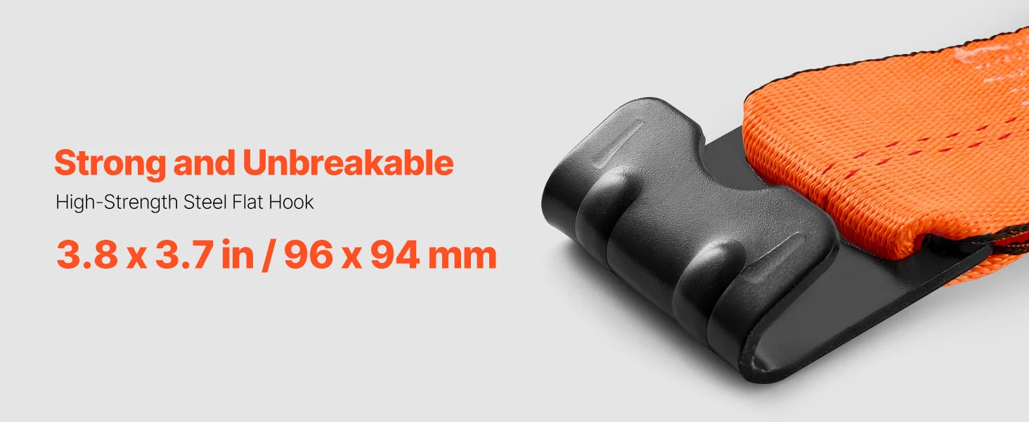 Durable Steel Flat Hook: Designed with a robust black steel flat hook on one end, this heavy-duty winch strap ensures a secure connection to your vehicle. Attach the strap to your cargo, then connect the flat hook to the vehicle's anchor point or side rails for a straightforward and efficient setup. This design simplifies the process, helping you secure your load quickly and with minimal effort.