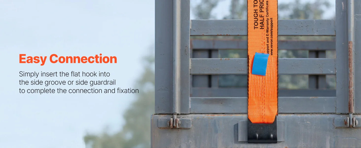 These 4-inch straps are equipped with a durable steel flat hook, simplifying the securing process—attach it to the trailer's an