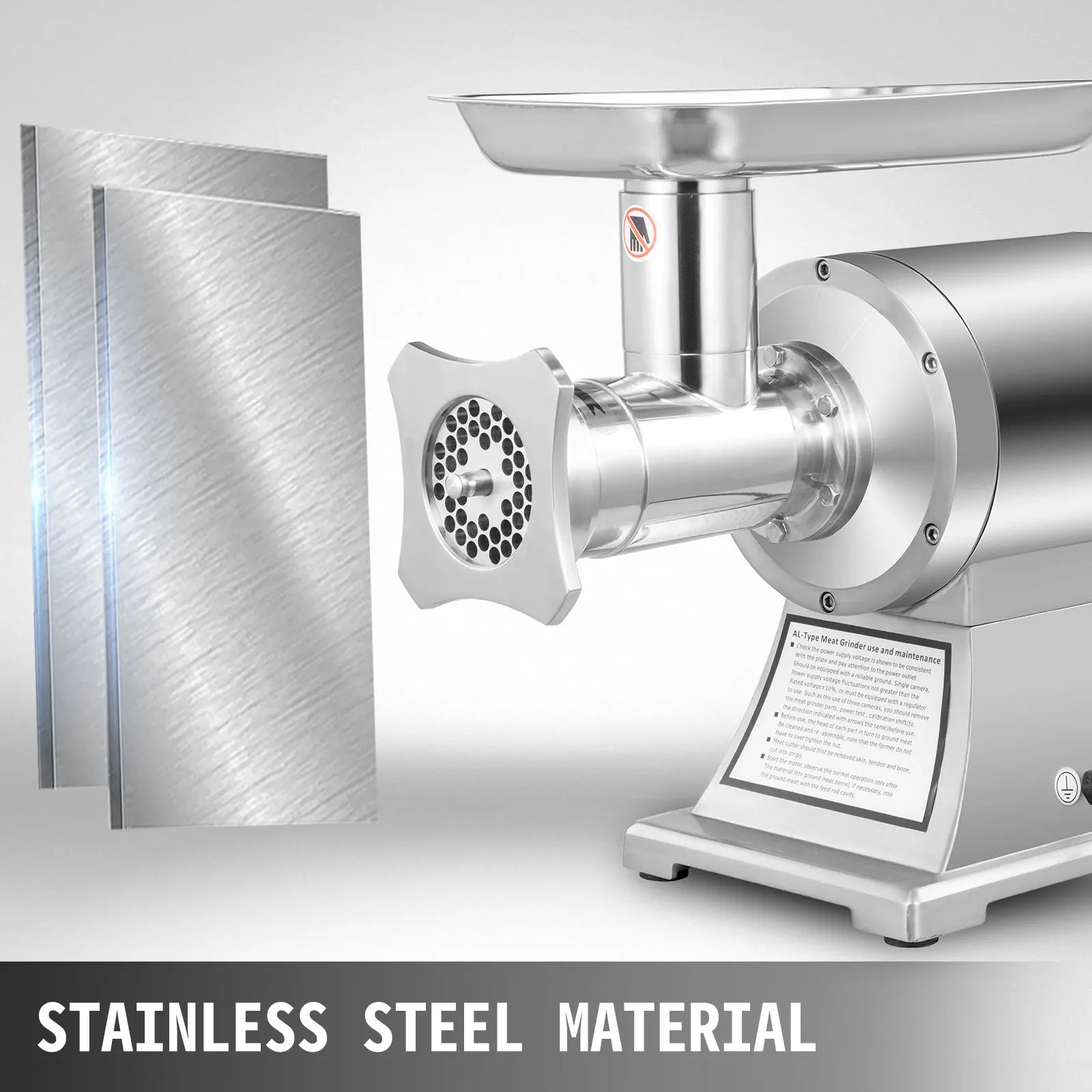 Well-Designed Details Includes a meat pusher for easy meat stuffing and two grinding plates (6 mm and 8 mm). The 6 mm plate is pre-installed, with an additional 8 mm plate provided for coarse or fine grinding. Specifications: 220V / 50Hz, 550LB/H blade speed, 1100W motor power, 225RPM cutting speed.