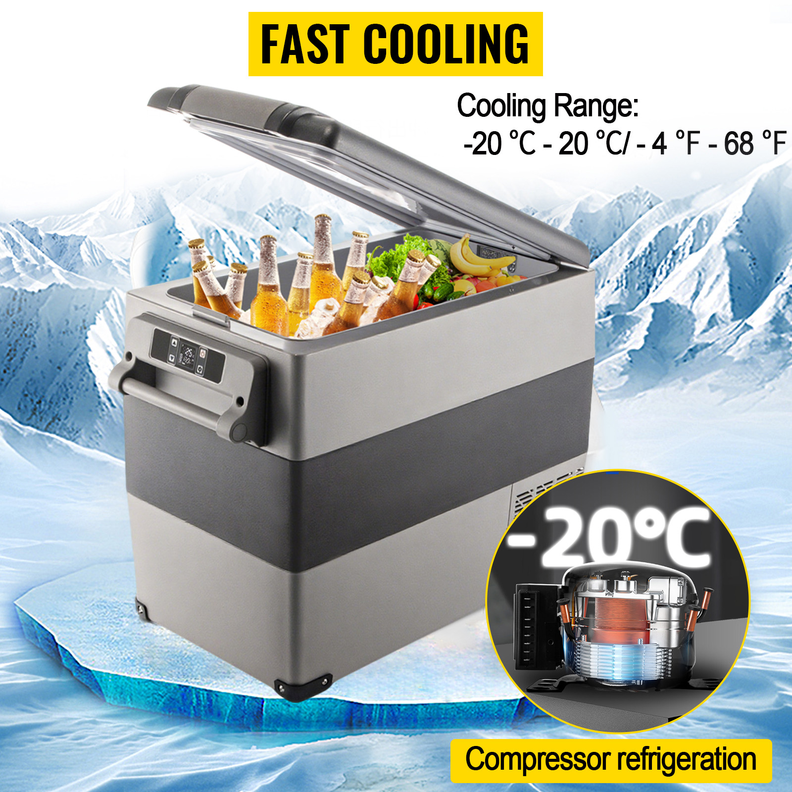 Efficient Refrigeration: Utilizing advanced compressor refrigeration technology, this 12V car freezer quickly cools from -20℃ to 20℃ (-4℉ to 68℉), ensuring your food and drinks stay fresh. It's perfect for travel, picnics, barbecues, camping, and parties.