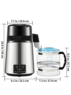 Premium Materials & Rapid Cooling: Crafted from food-grade 304 stainless steel, the distiller’s internal components, including the tank and water outlet, ensure durability and safe contact with water. The 1.03-gallon (3.9-liter) glass carafe is designed to withstand heat, while the built-in 4-blade aluminum fan and SUS 304 condensing coil provide efficient cooling and extended lifespan.