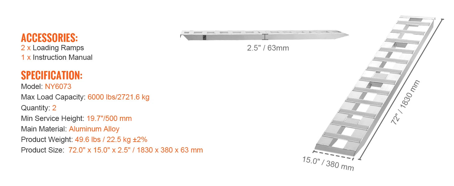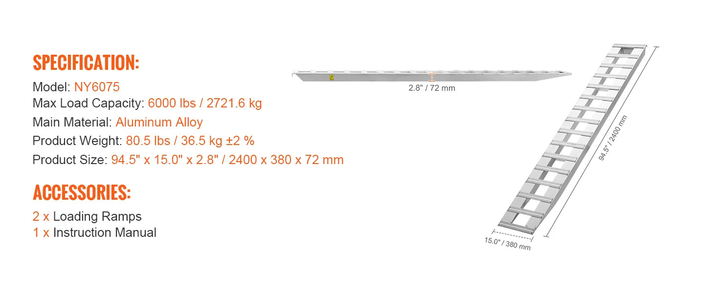 The SucceBuy Aluminum Loading Ramp, with a 6,000 lbs weight capacity, is designed for smooth and secure loading of heavy vehicles and equipment. Its ultra-light construction enables easy handling and quick setup, while the stair-step anti-slip boards ensure stability and grip, evenly distributing weight across the ramp. Measuring 72" x 15", this ramp is ideal for use in farms, factories, auto repair shops, and roadside assistance operations.