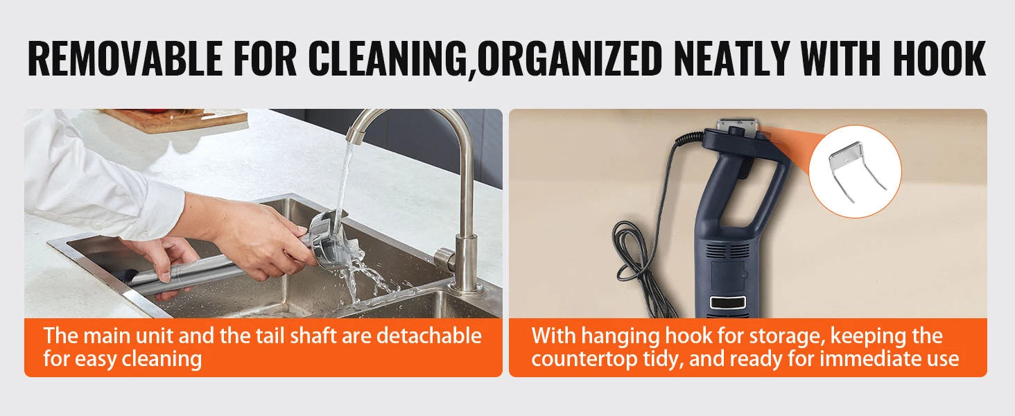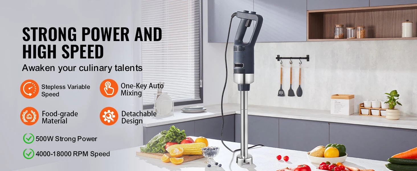 Powerful Motor: With 500W power, it efficiently blends and unlocks nutrients. Handles professional use. Stepless Variable Speed: Adjust from 4000 to 16000rpm for precise texture control. One-Touch Auto Operation: Quick start, comfortable grip, and hanging hook for storage. Food-Grade Materials: Stainless steel construction, triple blade, and splash-proof. Detachable Design: Handles diverse ingredients and easy to clean after use.