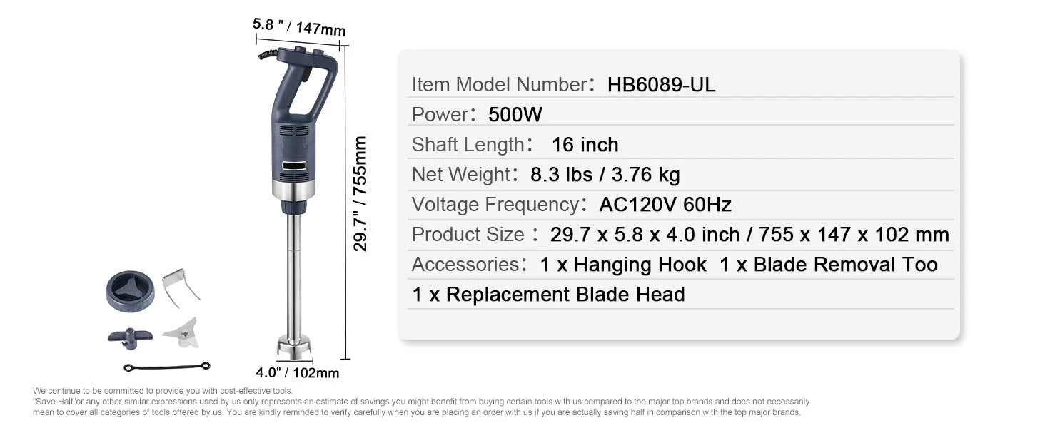 Shaft Length: 16 inch Product Size: 755 x 147 x 102 mm / 29.7 x 5.8 x 4 inch Net Weight: 3.76 kg ± 5% / 8.3 lbs Power: 500W ±15% Voltage Frequency: AC120V 60Hz Item Model Number: HB6089-UL