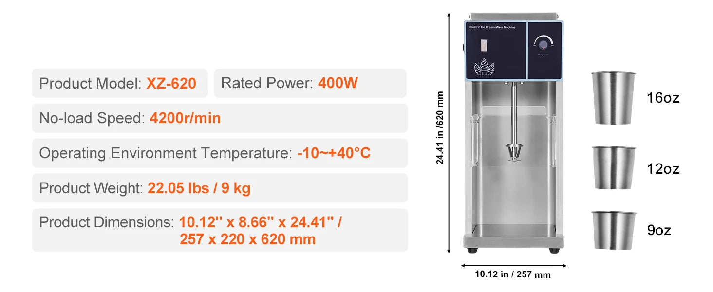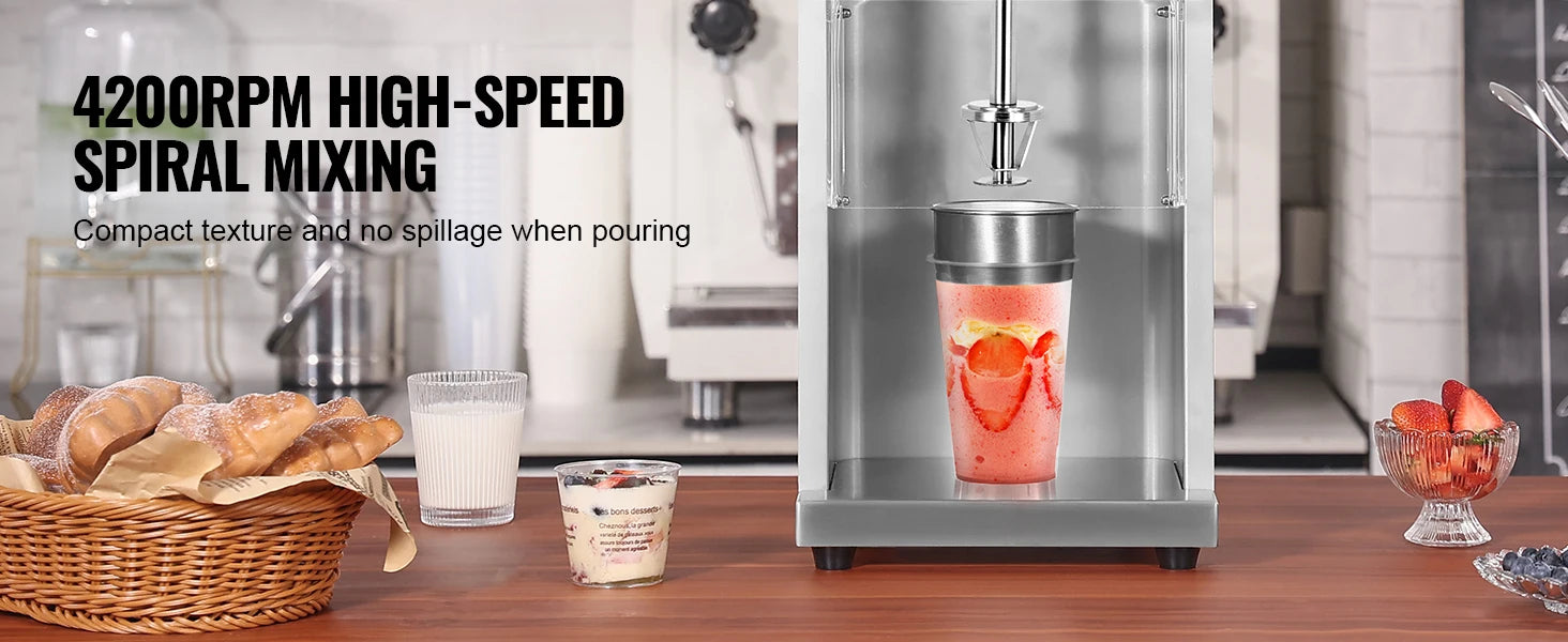 Durable Stainless Steel Construction: Built to last, the ice cream blender is made from high-quality 304 stainless steel, with both the body and mixing head featuring seamless welding for superior strength and longevity. Its large side ventilation holes promote efficient heat dissipation, ensuring reliable performance and extended machine life during prolonged use. User-Friendly Design: Featuring a food-grade 304 stainless steel cup ring, this blender securely holds paper cups with tapered top and bottom diameters, preventing slippage during mixing. The transparent PC splash guard keeps your workspace clean by preventing messes. Additionally, four rubber feet provide added stability during operation. Effortless Mixing Performance: Powered by a 400W full copper motor, this blender operates at a high-speed 4200rpm, delivering fast, even mixing of various ingredients for smooth, delicious ice creams and milkshakes. Perfect for blending all your favorite cold treats with minimal effort. Simple, Adjustable Operation: The easy-to-use rotary knob provides stepless speed control, allowing you to adjust the mixing speed from high to low based on your desired consistency. This versatile feature ensures that all your blending needs—whether for thick shakes or smooth ice creams—are easily met. Versatile Functionality: Whether you're creating ice cream, milkshakes, yogurt, juices, or smoothies, this blender handles it all. With its powerful motor and flexible cup sizes (9/12/16 oz), it's the ideal tool for making a wide range of cold beverages and desserts to suit any occasion.