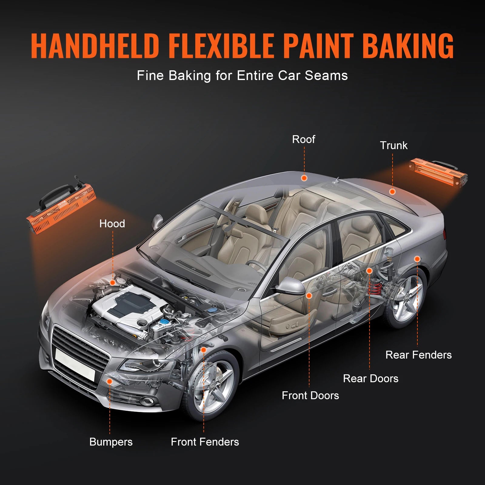 Safety Protection:We offer high-quality halogen lamp tubes and an anti-oxidation stainless steel lamp cover for safety. The thickened base ensures stability and no shaking, allowing for long-term worry-free use. No Installation Required:Forget about complicated installation. Just plug it into the power socket and it's ready to work. This multi-purpose lamp can handle drying tasks for automotive primers, film applications, and wall paint with ease. 1000W Quick Drying:The handheld lamp head dries primer quickly, covering 2.48 sq.ft / 0.23㎡. The short-wave infrared has high penetration, and the quartz lamp tube boosts gloss. It's for those seeking efficient and high-quality painting. Anti-Scald Design:The overall design has smooth edges to avoid hand scratches. It also has an anti-scald grille and heat dissipation holes to prevent overheating and accidental burns for comfortable operation. Full Car Baking:This paint dryer offers 360° full-car coverage, meeting all painting needs from bumper to rear. It covers every part of the car, providing a comprehensive and efficient painting solution.