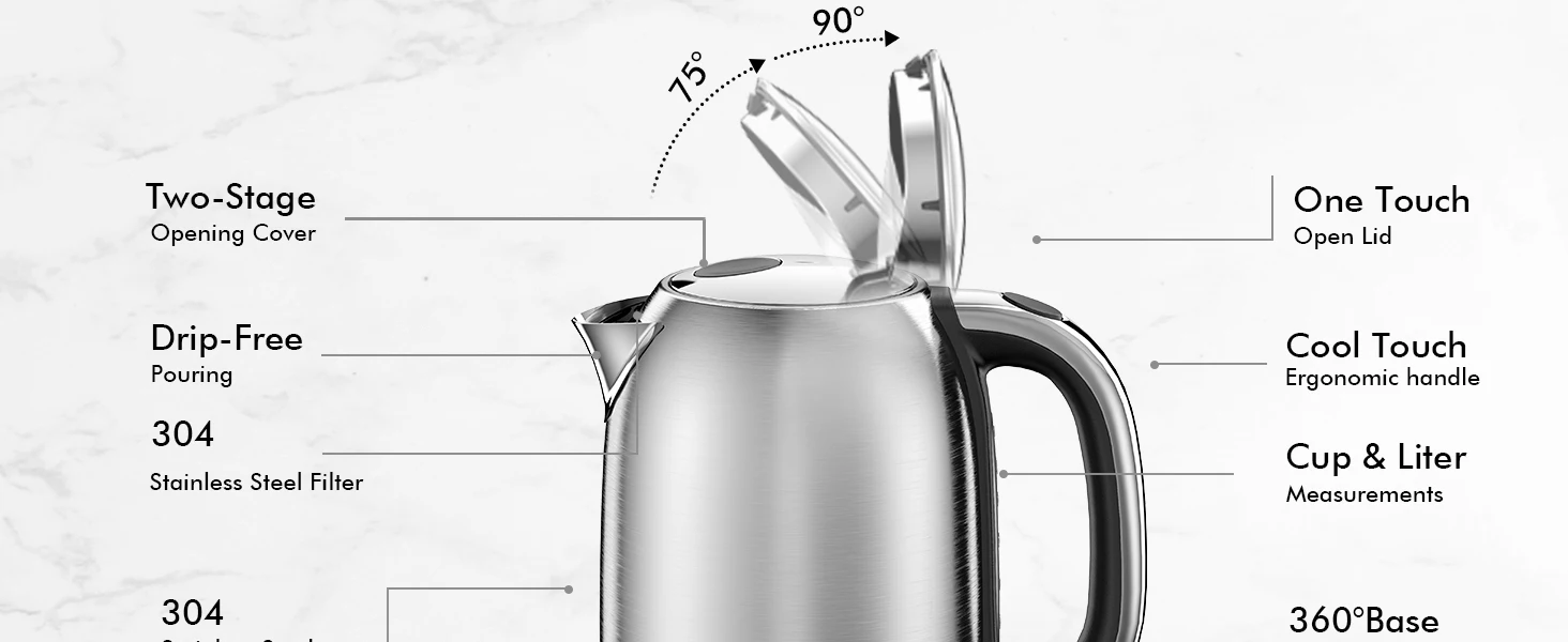 360Β° Swivel Base with 39.37" Extra-Long Cord: Use your kettle from any angle with our rotating base. When not attached, it's cord-free for easy pouring. The cord tucks away neatly into the base's own storage. It's got a cool-touch handle, push button, and flip-top lid to avoid burns