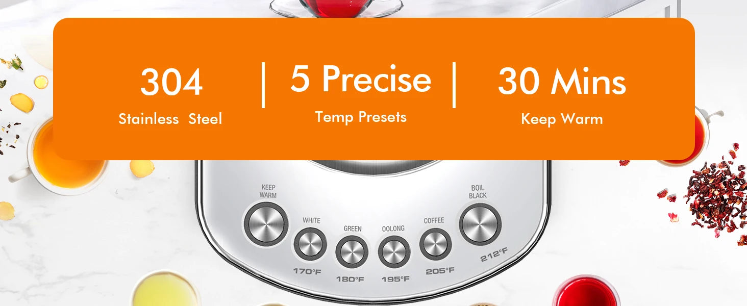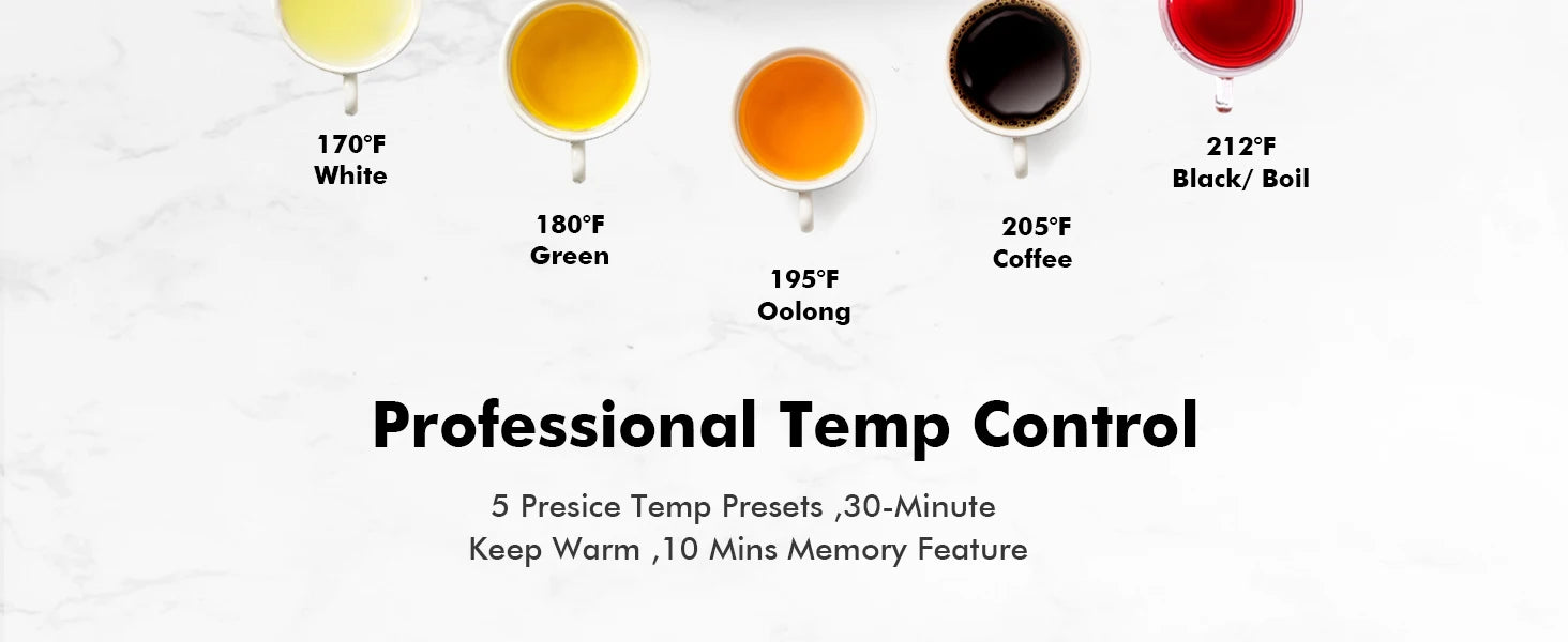 One-Touch 6 Tea Modes: Experience the perfect brew every time with our Electric Kettle! The advanced settings include presets for White, Green, Oolong, and Black teas, swiftly crafting your ideal tea temperature. A bonus Keep Warm for 30 Minutes function makes tea time a delight. Ideal for both new and seasoned tea connoisseurs