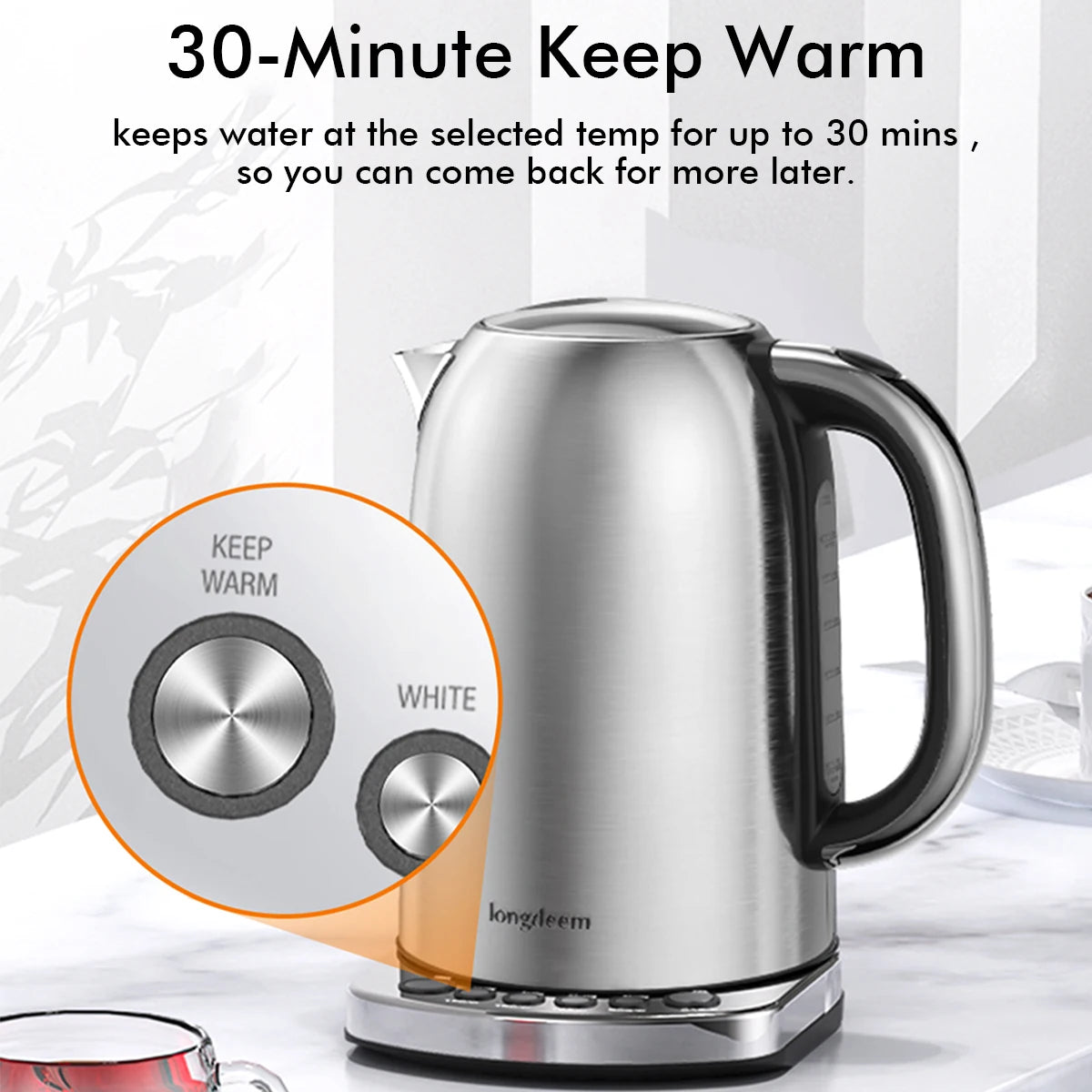 Intelligent Keep Warm Mode: When keep warm mode is on, the Longdeem kettle will automatically maintain the selected temperature for 30 minutes. If the kettle is returned to the base within 10 minutes of being lifted, it will resume the previously set function
