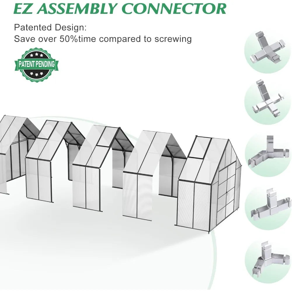 • 🌻【Quick & Easy Assembly】Our upgraded polycarbonate greenhouse designed with quick-fit connectors,adults can complete the installation within 4 hours. This greenhouse with modular design can be put together directly, the parts to be very precisely machined and they all fit together perfectly including where the holes were drilled.