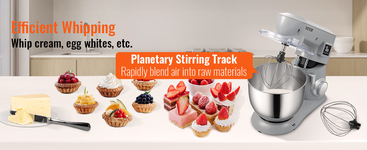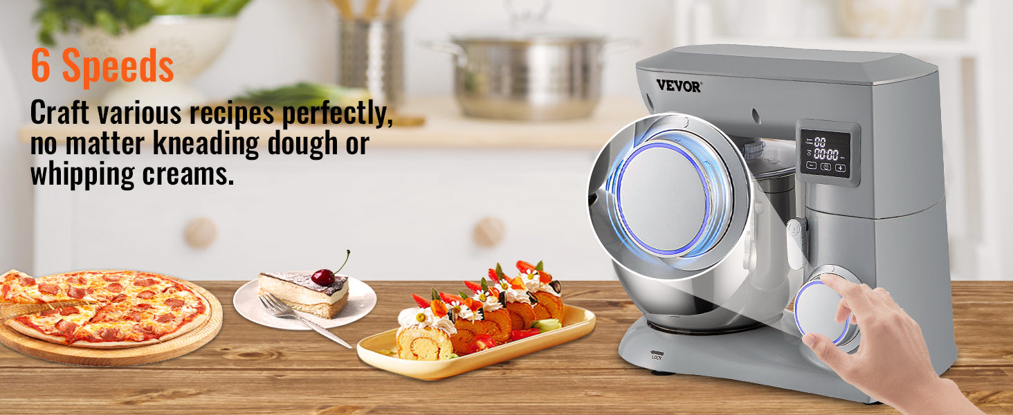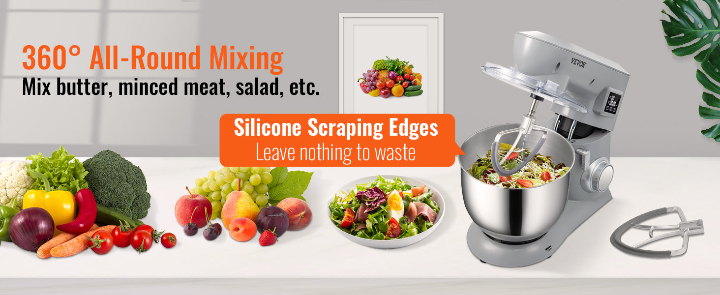 Never Worry About Mixing: Are you ready to mix! Don't stop! The planetary mixing and stirring mechanisms greatly contribute to full contact between the beater and the bowl's inner wall. The flat beater is designed with a soft silicone edge, which can effortlessly scrape off the sticky ingredients on the bowl and then mix them together. It doesn't even matter if they are left on the sides or at the bottom. Don't hesitate to knead dough and various bakery essentials with VEVOR's commercial mixer.