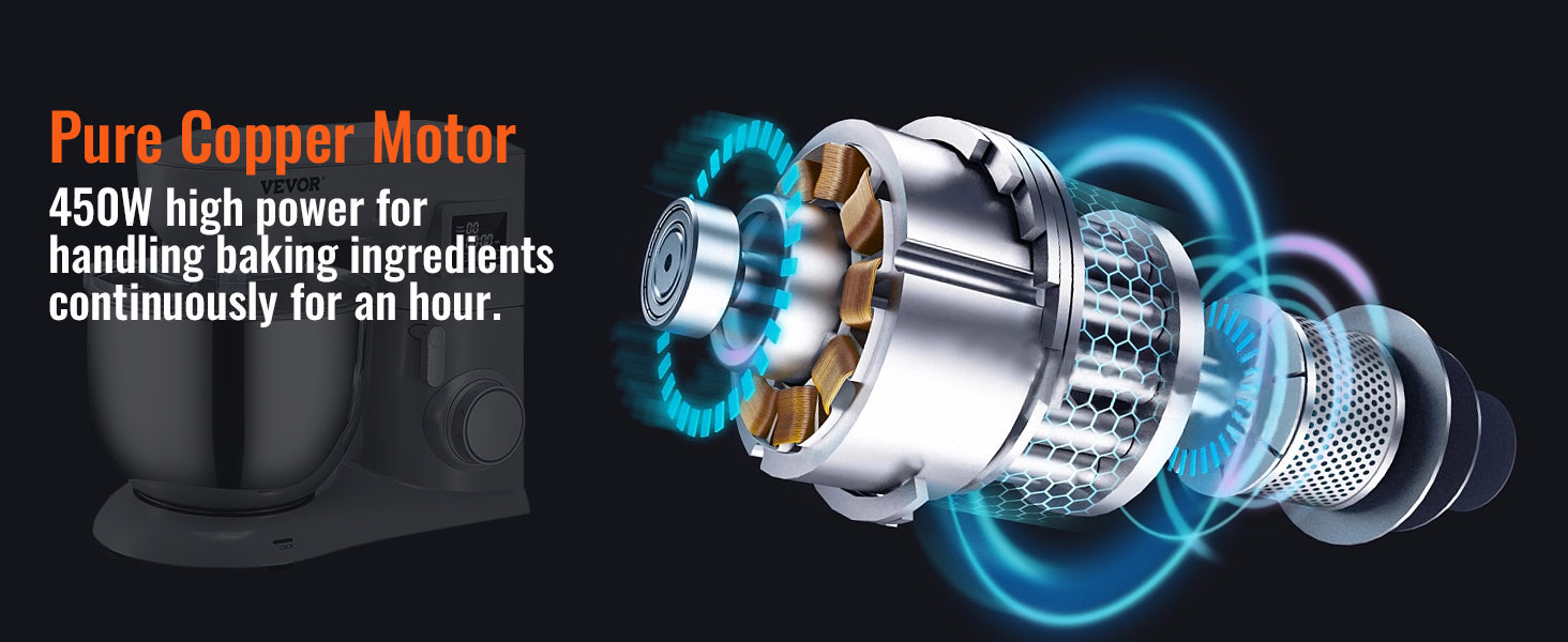 Unstoppable 6-Speed Pure Copper Motor: Equipped with a 450 W gear-driven copper motor, this mixer features continuous high-torque mixing, quiet operation, and outstanding reliability, standing up to the most demanding work in your kitchen. 6 speed levels allow you to perfectly mix different products at different speeds, from kneading dough slowly to whipping cream quickly. 1st-2nd speed for dough, 3rd-4th for butter & salad, 5th-6th for cream & egg white. Start mixing like never before.