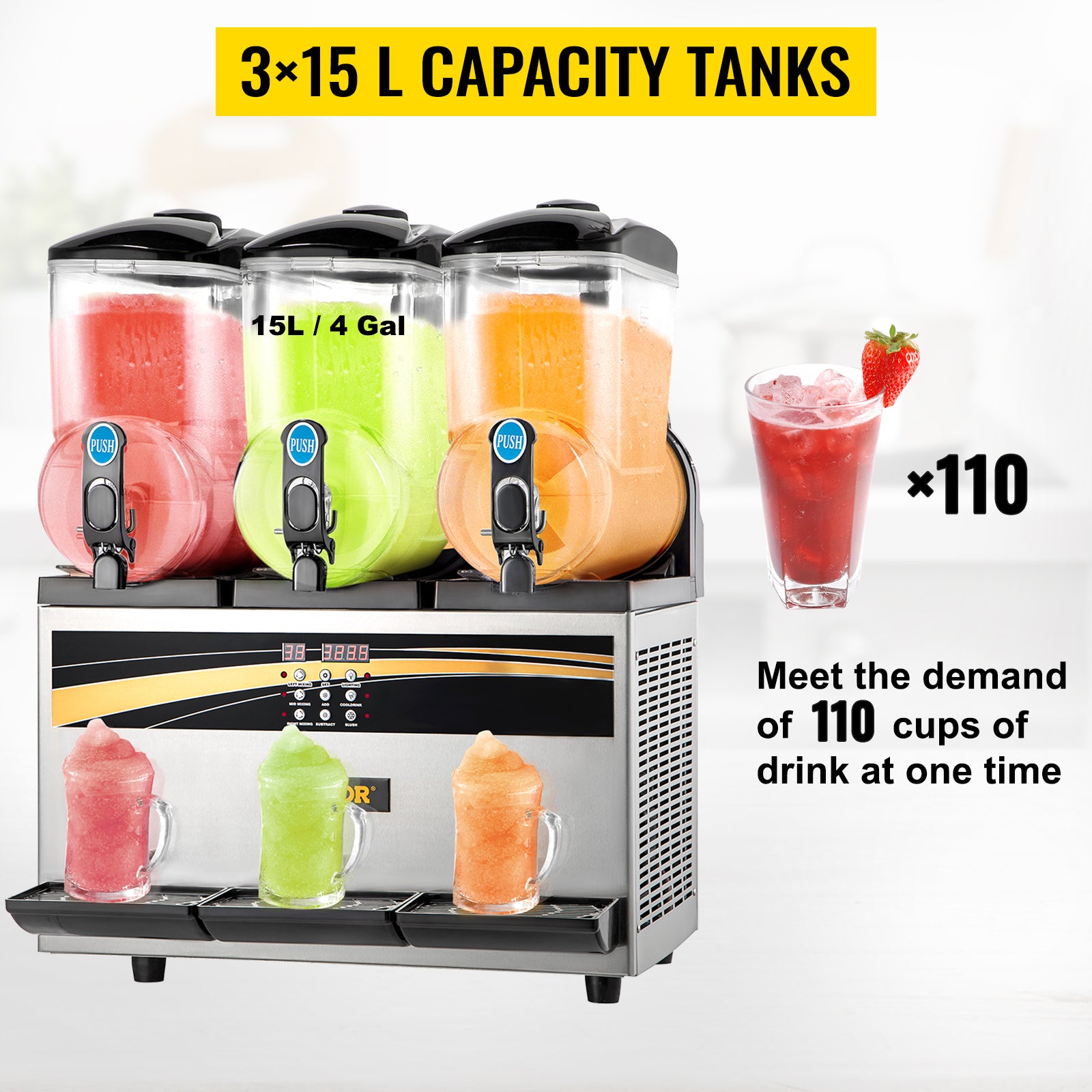 - 45L/ 12Gal Slushy Machine: With triple tanks 15 L x 3 / 4 US gallon x 3 capacity, this frozen slush machine can hold a great number of slushies and drinks, and it can be used for different flavors. An interior bowl light illuminates your beverages, thus showcasing their vibrant colors and helping them sell themselves.