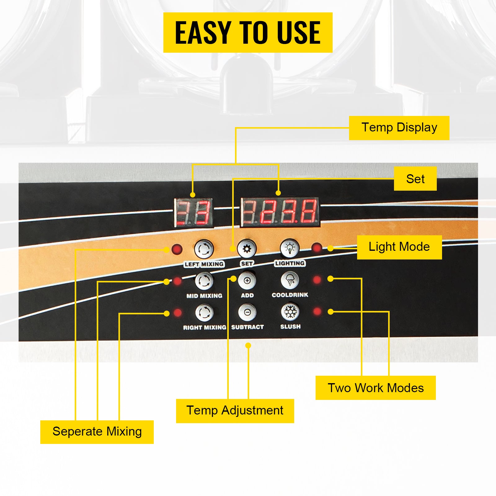 - Precise Control Area: Brief control panel is equipped on the machine. Each bowl operates independently and can be switched on/off or between cool drink and slush modes. Designed with the preservation function, you can set the temperature from 26.6 °F to 28.4 °F (-3~-2 ℃) to keep the slushies fresh. You can use the panel according to your needs.