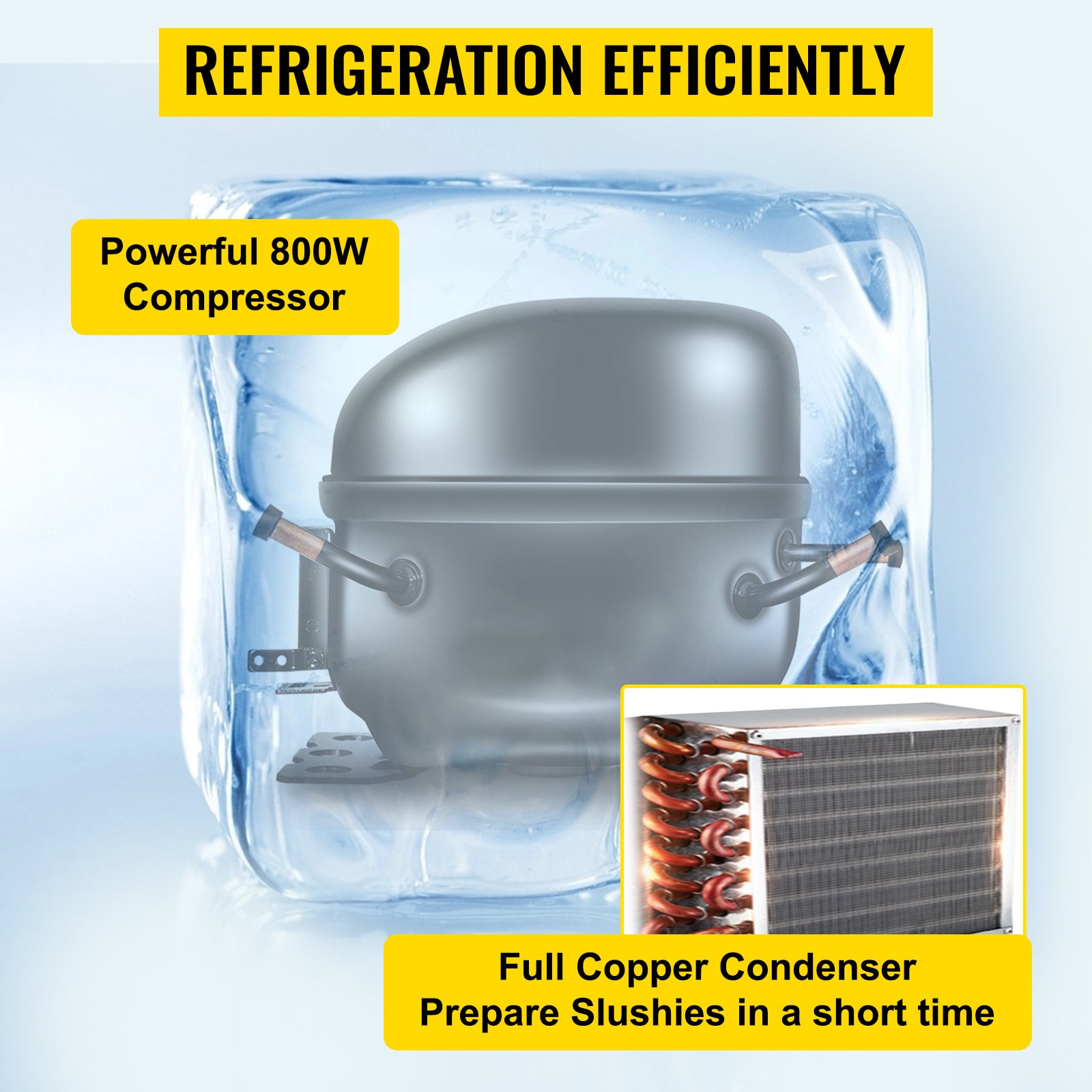 - Powerful Compressor: This frozen drink maker featuring an 800-watt powerful compressor for rapid cooling, energy-saving, and low noise. It allows you to prepare slushies in 50 minutes. With the antifreeze cylinder system, the machine can automatically start and cease to solve the freezing problem of the cylinder, thus extending the machine's service life. A superior quality condenser ensures fast refrigeration and stable operation.