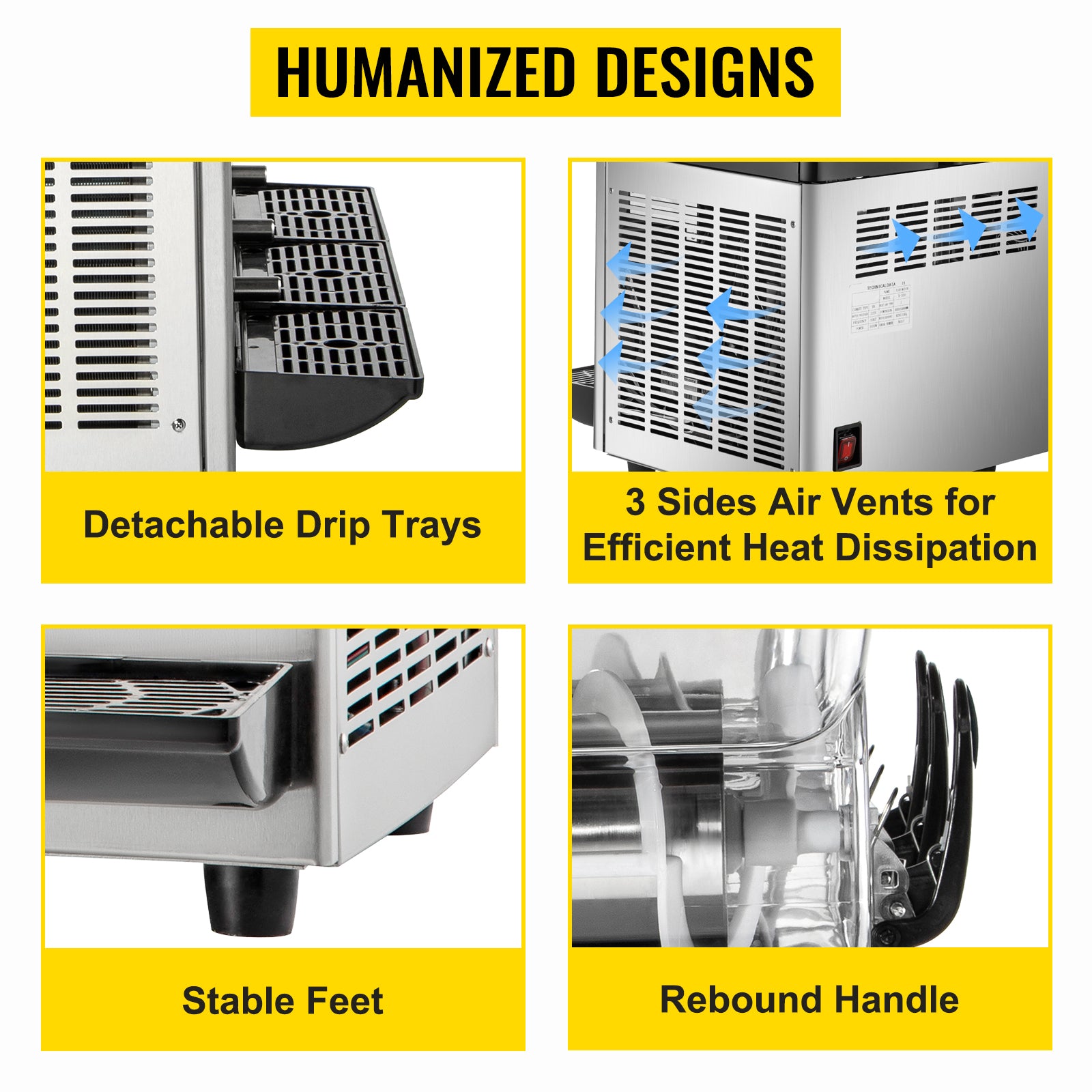 This machine boasts extra-long dispenser handles and detachable trip trays that allow for easy operation. In addition, 3 sides air vents can effectively heat dissipation. The rubber feet also keep the machine steady.