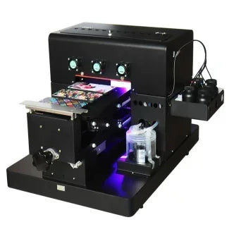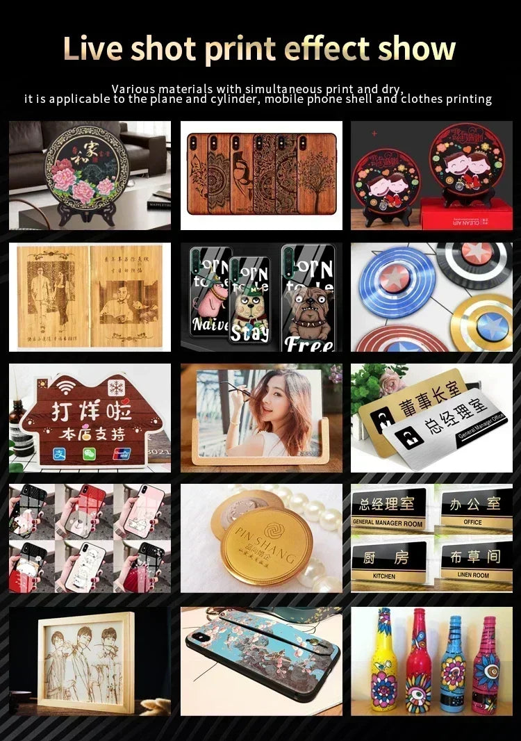 This is a brand new A4 UV printer designed for precise printing on flat surfaces. It is easy operating and of universal usage. Not only is it suitable for different kinds of plastic, fabric, and leather, you can also count on it while printing on metals, wood, bamboo, glass, ceramic, stone and so on. UV printers are widely used for making mobile phone shells, puzzles, scutcheons, labels, decoration pictures, leatherwares, etc.