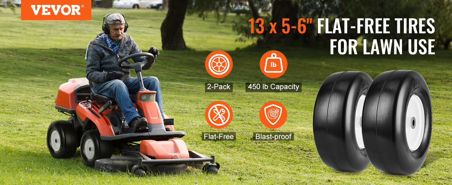 Lawn Mover Tires Size: Tire diameter:13"; Tire width: 5"; Rim diameter: 6". Our lawn mower tires are crafted to fit most lawn mowers and lawn tractor models, ensuring a perfect match.
