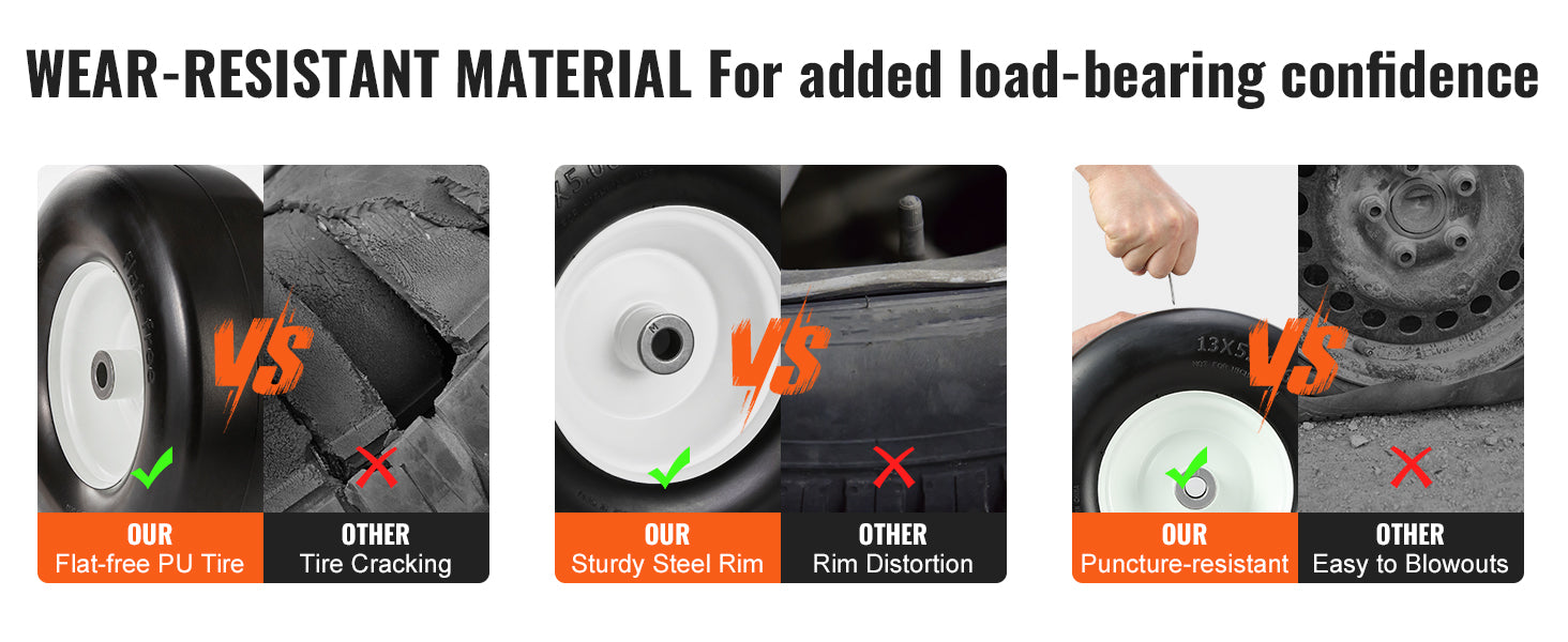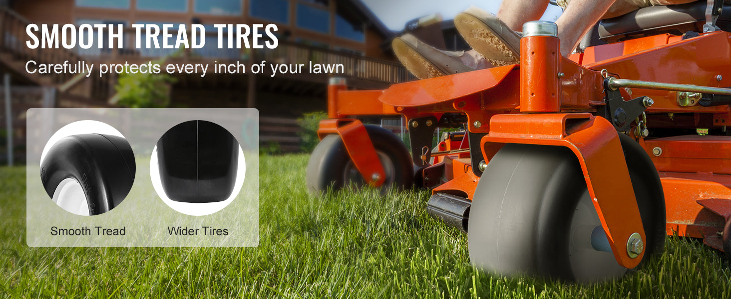 Flat-free PU Tires: Crafted from PU material, our lawn mower tires are flat-free, wear resistance, and puncture protection. Low maintenance saves you time and labor. Ready to use without worries.