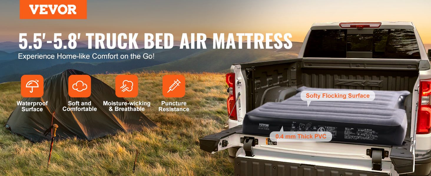Premium Materials: The truck bed air mattress is crafted with a high-quality flocking PVC top, durable PVC sides, and a tough polyester Tuff PVC bottom with a 0.016"/0.4 mm thickness. The camping mattress is designed for comfort, boasting a waterproof surface, resistance to punctures and leaks, and an excellent air buffer effect for optimal support of your back, neck, legs, and body.