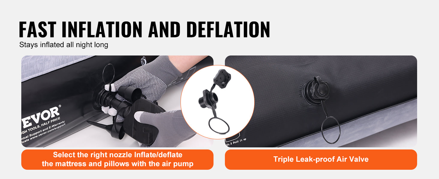 Effortless Inflation & Deflation: Equipped with a 196.9" / 5 m pump line, this full-size truck bed air mattress can be quickly inflated or deflated using the included air pump connected to a 12V cigarette lighter. The air mattress charging valve features a three-layer leak-proof design, ensuring durability and minimal air leakage.