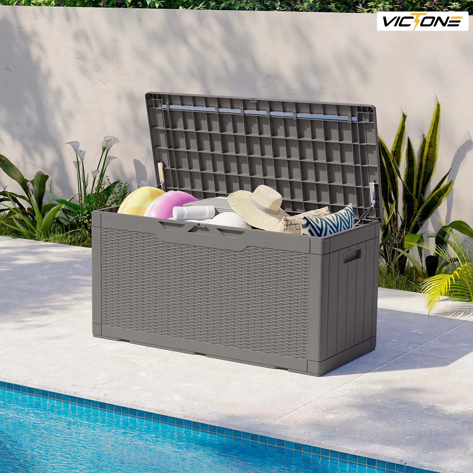 【Elegant and stylish】The deck box has a rattan design that adds a touch of elegance to your outdoor decor. It comes in two colors, brown and grey, to match your preference and style.