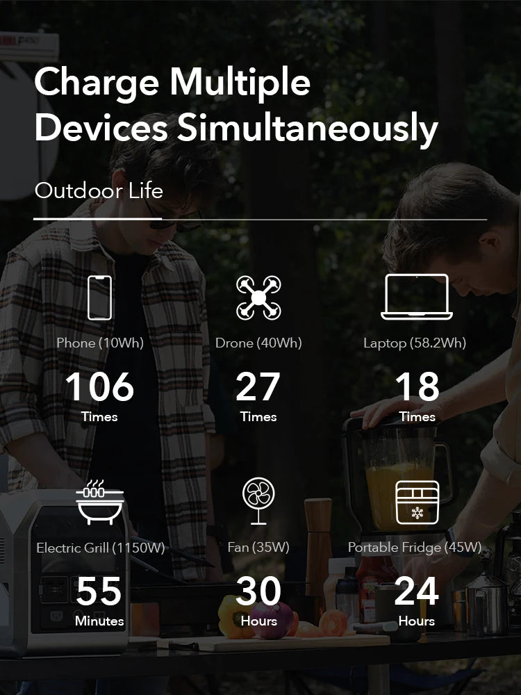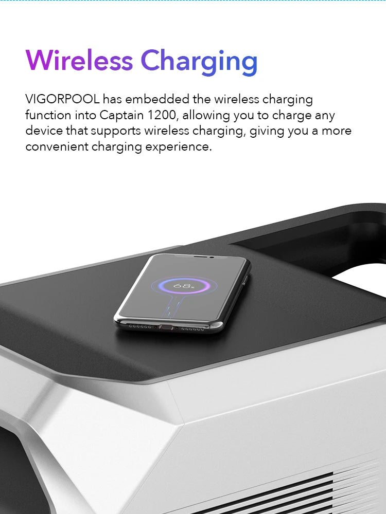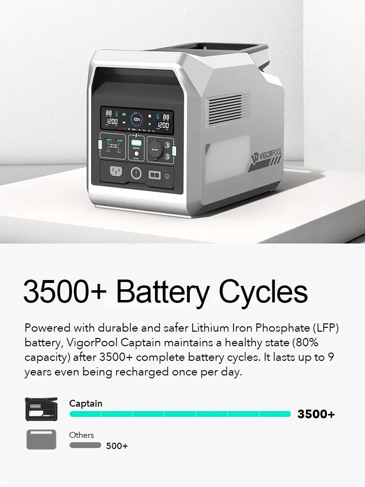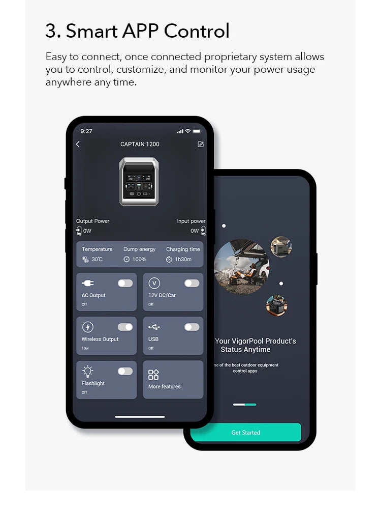 【Power for All】: 12 Devices Simultaneously Meet the needs of your entire household with the Captain 1200’s generous 12-output ports, enabling simultaneous charging of up to twelve devices. Stay in command of your energy consumption with the intuitive Vigorpool app, providing real-time monitoring and control at your fingertips.
